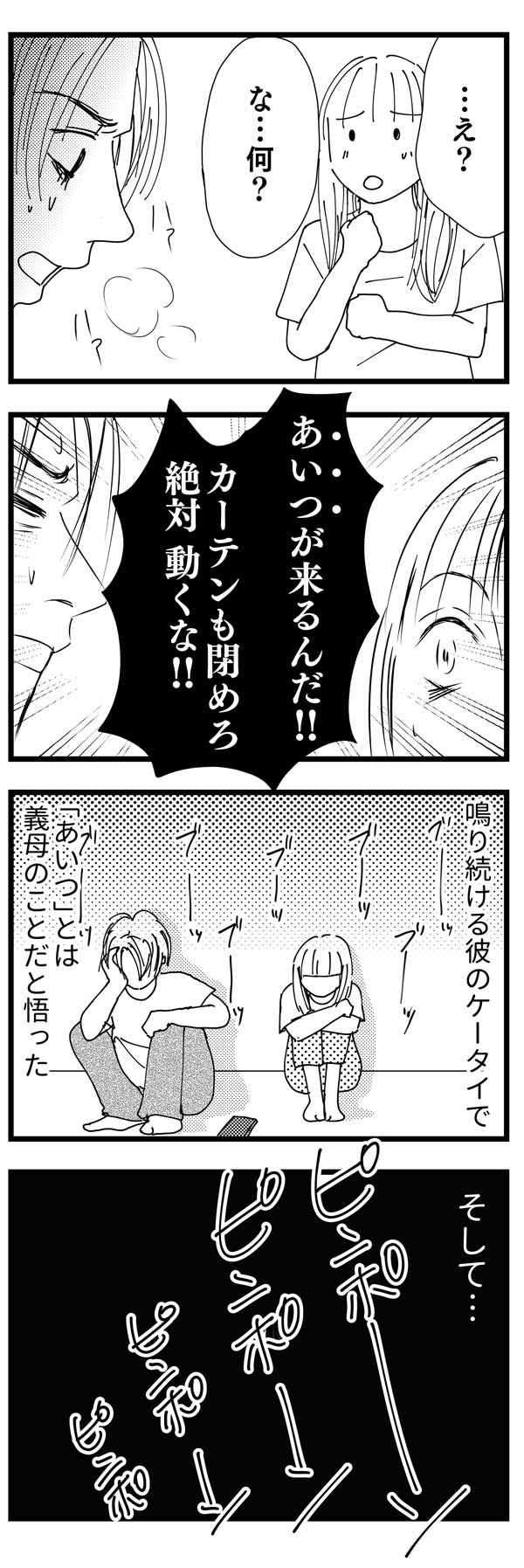 サイゾーウーマンカルチャーマンガ音咲椿『婚約破棄で訴えてやる!~毒親持ち彼氏と167日間壮絶バトル~』【毒親41話】あいつが来るんだ! カルチャー 【マンガ】私の彼が毒親から逃れられない!~婚約破棄で訴えてやる・番外編~ 【毒親マンガ】「あいつが来るんだ!」冷静さを失った彼――息をひそめ、隠れるふたり【41話】 2019/08/19 13:30 音咲椿 マンガ毒親音咲椿婚約破棄で訴えてやる! 「君ってなんだか、僕の母に似てるんだよね」――。 イケメン彼氏の「不可解」な婚約破棄と、それに伴う顛末を描いた実録コミックエッセイ 『婚約破棄で訴えてやる!~毒親持ち彼氏と167日間壮絶バトル~』の前日談。 婚約していた彼は、なぜ突然手のひらを返したのか? あんなに嫌悪していたはずの“毒母”側についたのはどうして? 交際していた当時の記憶から あの頃の彼の心理と背景を掘り下げてみると、意外な事実が見えてきた――! あいつが来る! ――『私の彼が毒親から逃れられない!』は毎週月・火更新。お楽しみに! ⇒このマンガへのコメントを読む・書く <バックナンバーはこちら> ■第1回……婚約破棄から10年、残る疑問 ■第2回……彼のママは専業主婦だった ■第3回……「辞表出しといた」って!? ■第4回……我が子にセックス回数を暴露!? ■第5回……実家暮らしだった彼と、恋に落ちるまで ■第6回……彼の誕生日に、何度も電話が……。 ■第7回……彼母の「息子依存」が過剰すぎる? ■第8回……朝4時、彼は電話で謝罪中 ■第9回……バツイチの私、義母からの印象は? ■第10回…いよいよ彼母と初対面の日 ■第11回…初めて会った彼母は……! ■第12回…「過去の彼女」と比較された ■第13回…彼母に受け入れられた……! ■第14回…「君は、僕の母に似てるね」 ■第15回…両家の顔合わせも上々で…? ■第16回…実家とアパートを往復する彼 ■第17回…母に「汚い」って言われたんだ ■第18回…母にエロ原稿を見られた ■第19回…実母に「クズ」と罵られた ■第20回…我が子の仕事を否定 ■第21回…彼母の抱える「トラウマ」 ■第22回…「月5万払え」って!? ■第23回…月イチで「毒親被害」に遭う彼 ■第24回…DVの構造そっくり! ■第25回…彼の努力が報われた! ■第26回…印税が入ってくる! ■第27回…印税を毒母に渡したら ■第28回…「恥知らず」の「汚れたカネ」 ■第29回…彼母は普通の親じゃない? ■第30回…もう逃げるしかないね ■第31回…彼母は更年期障害? ■第32回…プロポーズに喜べない ■第33回…プロポーズを”延期” ■第34回…彼母と一緒にお墓参り ■第35回…これが「鬼母」なの? ■第36回…私って冷たいのかな ■第37回…お彼岸に「お墓で写真」 ■第38回…「子どもを作ろう」って!? ■第39回…子は「自己満足」の道具? ■第40回…急転!彼が怒鳴ったワケ ■前作……『婚約破棄で訴えてやる!』1-3話 *** 前作『婚約破棄で訴えてやる!』は、電子書籍にてすべてご覧いただけます。 ★★★各電子書店にてお買い求めいただけます★★★ 音咲椿(おとさき・つばき) 男性向けグラビア誌編集長を経て、ポット出版社刊「女の子×女の子のためのエロチックブック・Carmilla」にてイラスト・漫画家デビュー。 単行本「イケメン外国人たちとベッドで異文化交流した結果。」(ぶんか社刊)好評発売・配信中。 マンガ「『こんな大きいなんて聞いてない!』~外国人と異文化SEX、ヤりまくりました。」「婚約破棄で訴えてやる!~毒親持ち彼氏と167日間壮絶バトル~」配信中。 音咲椿Twitter(@otosaki6666) 最終更新:2019/08/19 13:44 怖すぎてドキドキする 関連記事 【マンガ】私の彼が毒親から逃れられない! ~婚約破棄で訴えてやる・番外編~【新連載】【毒親マンガ】彼からのプロポーズを”延期”した私――その真意は【33話】【マンガ】スリランカ「連続爆破テロ」現地レポート! 民衆パニックで起きたこと【1-2】【マンガ】生理中の気分転換は「ベッドの中でもできること」!【第79回】【マンガ】カネ儲けしたい主婦、家族に思い切って告げてみた――! その結果は!?【2-2】 その他の作品を読むバックナンバーを読む 次の記事 嵐・相葉、“激似女優”とドラマ共演 >