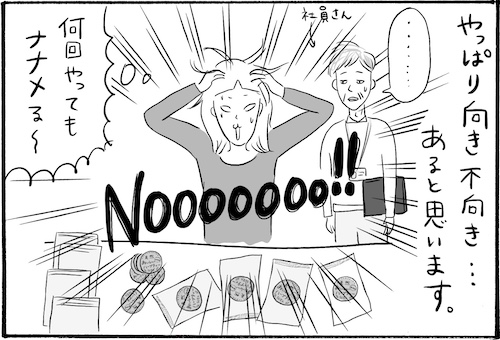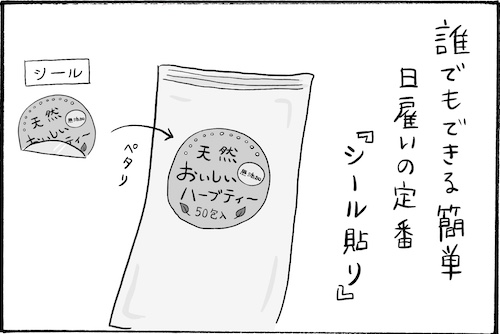 サイゾーウーマンカルチャーマンガ柿ノ種まきこ『アラサー独身女、今日も日雇いで生きてます』【漫画】日雇いの向き不向き カルチャー 【連載】柿ノ種まきこ『アラサー独身女、今日も日雇いで生きてます』 【日雇いマンガ】62話『できないのは私だけ!? 簡単作業の落とし穴〜その2〜』 2019/08/29 13:00 柿ノ種まきこ マンガ柿ノ種まき子日雇い ――「キツイ」「汚い」「男臭い」……なんとなく近寄りがたいイメージのある“日雇労働”。その、実態はどのようなものなのか? 日雇い労働を生業とするアラサー・柿ノ種まきこが、日雇いの日々と人間模様を紹介します。 第62話『できないのは私だけ!? 簡単作業の落とし穴〜その2〜』 どうしても自分には合わない作業ってありますよね……。何回やっても斜めるシールにイライライライラ……! この後、静かに社員さんに別作業に連れいかれました……。 ――毎週、木曜日に最新話を更新。次回63話は年9月5日(木)の更新予定です。 柿ノ種まきこ/@kakinotane_makiko 日雇いをしながらマンガを描くアラサー。過去には、「iVERY」にて婚活マンガ『女もつらいよ』を連載。現在はインスタグラムにて、マンガを不定期投稿。 https://www.instagram.com/kakinotane_makiko/ 最終更新:2019/08/29 13:00 関連記事 【日雇いマンガ】『アラサー独身女、今日も日雇いで生きてます』【36~42話まとめ読み】【日雇いマンガ】『アラサー独身女、今日も日雇いで生きてます』【29~35話まとめ読み】【日雇いマンガ】『アラサー独身女、今日も日雇いで生きてます』【22~28話まとめ読み】【日雇いマンガ】『アラサー独身女、今日も日雇いで生きてます』【15~21話まとめ読み】【日雇いマンガ】『アラサー独身女、今日も日雇いで生きてます』【8~14話まとめ読み】 その他の作品を読むバックナンバーを読む 次の記事 工藤静香「二科展絵画&ビキニ姿」公開 >