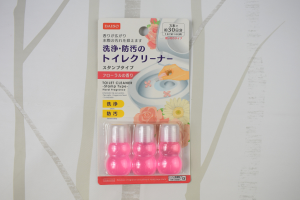 サイゾーウーマン暮らし100均・雑貨ダイソー「洗浄・防汚のトイレクリーナー」レビュー 暮らし 【100均ずぼらシュラン】 【100均ずぼらシュラン】ダイソー「洗浄・防汚のトイレクリーナー」が小林製薬のアレにソックリ! 2019/09/12 17:00 ずばら均子 ダイソー100均100均ずぼらシュラン 安くてお得に日用品を買いに行ったつもりが、あれもこれもとカゴに入れてしまう100均ショップ。「超便利!」とほくそ笑むグッズもあれば、「買わなきゃよかった……」なトホホなグッズも潜む、魑魅魍魎な100均ワールドをズボラなアラサー女子がご案内! 私見全開でアイテムを斬る「ダイソーずぼらシュラン」開店です★ 今日のダイソーアイテム【洗浄・防汚のトイレクリーナー】 便利度:★★★★★(トイレ洗浄剤を簡単にスタンプ可能!) コスパ:★★★★☆(合計30日分の洗剤が入ってす) 香り:★★★★★(フローラルな香りが広がりますよ!) トイレのお掃除って、正直いってかなり面倒ですよね。そこで今回は、ダイソーで売っている「洗浄・防汚のトイレクリーナー」を試してみました。便器の表面にジェルを貼りつけることで汚れを防ぐアイテムです。 1パックには縦約5cm×2.5cmサイズの容器が3本入っています。1本につき約10日分の防汚効果があるので、合計で30日分の使用が可能。あくまで汚れを“防止する”洗剤なので、使用する前には便器を掃除しておく必要があるんだとか。そして、「陶器製の便器専用」と明記してありますね。 スタンプタイプのトイレ洗浄アイテムだと、ジョンソンの「スクラビングバブル」やアース製薬の「トワイト」、小林製薬の「ブルーレット デコラル」などをよく見かけますが、ダイソーのこれは、小林製薬の商品にかなり似てます。小林製薬のほうも、1本で約10日間使用できて、3本入り(約1カ月)。お値段は¥598(Amazon調べ)なので、効果の違いはさておきダイソーのコスパはかなり高そうですね! 小林製薬 ブルーレット デコラル 次のページ さっそく、容器の先端を便器に押し当てプッシュ 12次のページ 関連記事 【100均ずぼらシュラン】調理中に大活躍!? ダイソー「立てて見れる防水ソフトケース」【100均ずぼらシュラン】整理整頓が進む! ダイソー「ダイカットジップバッグ ベアカフェ」【100均ずぼらシュラン】ダイソーのコスメ用品「リキッドファンデーションパフ(2枚)」の使用感は?【100均の収納アイテム・DIYグッズ】おすすめアイテム27選!【ダイソー・セリア・キャンドゥ・ワッツ】【100均ずぼらシュラン】絶賛に次ぐ絶賛の洗顔グッズ・ダイソー「繭玉」を実際に使ってみたら……