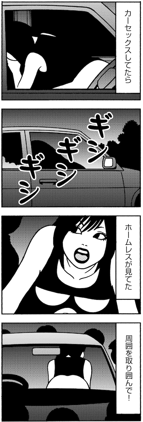 サイゾーウーマンカルチャーマンガ本当にあった笑える話【漫画】カーセックスでの災難 カルチャー 『本当にあった笑える話』(ぶんか社より) 【漫画・あなたの欲望バナシ】カーセックスに夢中になりすぎたカップルの恐怖体験 2019/09/30 11:00 『本当にあった笑える話』編集部 マンガ漫画本当にあった笑える話 【「本当にあった笑える話」(ぶんか社)より】 オーディエンス 〜神奈川県・48歳・事務・スケベがお好きさんからのお便り〜 ©チャールズ後藤/ぶんか社 ↓もっとマンガが読みたい方はコチラ↓ ぶんか社のコミックエッセイ・実話4コマ漫画が待てば無料で読める! スマホ向け漫画サイト『マンガよもんが』 『本当にあった笑える話』シリーズ誌では、みなさまからの投稿を随時募集しております。 テーマは「芸能人目撃談」「赤っ恥エピソード」「ペットトラブル」など幅広く募集中! →投稿は【こちらから】 最終更新:2019/09/30 11:00 その後が気になる… 関連記事 【漫画・恋愛トラブル】念願のイケメンとゴールイン! その正体は整形した、かつての……【マンガ・貧乏体験談】人気キャバ嬢から転落! ドンペリおごり女の悲しい末路【マンガ・病院トラブル】悲惨! 高校入学直前に整形した地味女の末路 【マンガ・金銭トラブル】ニューハーフに彼氏を寝取られた友人が、私を「鬼」と罵ったワケ【マンガ・人間が怖い!】高級デパートで客が大激怒! 脱糞トラブルにまで発展したワケ その他の作品を読む 次の記事 ニトリはお値段以上!? 購入者の本音 >