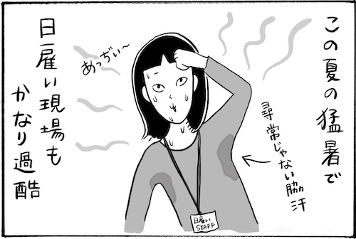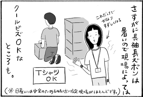 サイゾーウーマンカルチャーマンガ柿ノ種まきこ『アラサー独身女、今日も日雇いで生きてます』【漫画】クールビズすぎる現場 カルチャー 【連載】柿ノ種まきこ『アラサー独身女、今日も日雇いで生きてます』 【日雇いマンガ】67話『目のやり場にこまる!? 日雇い現場のクールビズ事情』 2019/10/03 13:00 柿ノ種まきこ マンガ柿ノ種まき子日雇い ――「キツイ」「汚い」「男臭い」……なんとなく近寄りがたいイメージのある“日雇労働”。その、実態はどのようなものなのか? 日雇い労働を生業とするアラサー・柿ノ種まきこが、日雇いの日々と人間模様を紹介します。 第67話『目のやり場にこまる!? 日雇い現場のクールビズ事情』 今年の夏は本当に暑かった……! エアコンのない倉庫作業は過酷でした。 だけどもだけど! そんなに薄着なのは……アリ? 目のやり場に困る現場でした。 ――毎週、木曜日に最新話を更新。次回68話は年10月10日(木)の更新予定です。 柿ノ種まきこ/@kakinotane_makiko 日雇いをしながらマンガを描くアラサー。過去には、「iVERY」にて婚活マンガ『女もつらいよ』を連載。現在はインスタグラムにて、マンガを不定期投稿。 https://www.instagram.com/kakinotane_makiko/ 最終更新:2019/10/03 13:00 関連記事 【日雇いマンガ】『アラサー独身女、今日も日雇いで生きてます』【36~42話まとめ読み】【日雇いマンガ】『アラサー独身女、今日も日雇いで生きてます』【29~35話まとめ読み】【日雇いマンガ】『アラサー独身女、今日も日雇いで生きてます』【22~28話まとめ読み】【日雇いマンガ】『アラサー独身女、今日も日雇いで生きてます』【15~21話まとめ読み】【日雇いマンガ】『アラサー独身女、今日も日雇いで生きてます』【8~14話まとめ読み】 その他の作品を読むバックナンバーを読む 次の記事 芸能人の減量レポート >
