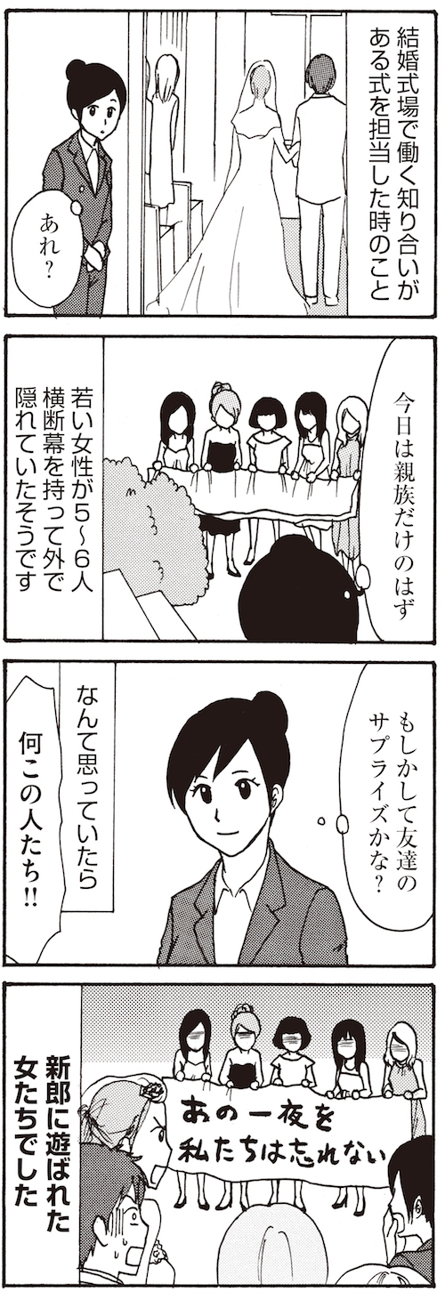 サイゾーウーマンカルチャーマンガ本当にあった笑える話【漫画】結婚式に元カノ5人登場 カルチャー 『本当にあった笑える話』(ぶんか社より) 【漫画・驚愕体験】結婚式場に元カノ5人集結! 彼女たちがとった信じ難い行動とは…… 2019/10/21 11:00 『本当にあった笑える話』編集部 マンガ漫画本当にあった笑える話 【「本当にあった笑える話」(ぶんか社)より】 驚きの演出 〜福岡県・20歳・大学生・剛力怪獣シルバゴンさんからのお便り〜 ©遥那もより/ぶんか社 ↓もっとマンガが読みたい方はコチラ↓ ぶんか社のコミックエッセイ・実話4コマ漫画が待てば無料で読める! スマホ向け漫画サイト『マンガよもんが』 『本当にあった笑える話』シリーズ誌では、みなさまからの投稿を随時募集しております。 テーマは「芸能人目撃談」「赤っ恥エピソード」「ペットトラブル」など幅広く募集中! →投稿は【こちらから】 最終更新:2019/10/21 11:00 元カノでもなかった! 関連記事 【漫画・貧乏体験談】飼い猫と彼氏のせいで10kgも激痩せしてしまった女【漫画・恋愛トラブル】ヤリチンバンドマンを解散に追い込んだ、元カノの驚愕の復讐方法!!【漫画・恋愛トラブル】念願のイケメンとゴールイン! その正体は整形した、かつての……【マンガ・病院トラブル】悲惨! 高校入学直前に整形した地味女の末路 【マンガ・金銭トラブル】ニューハーフに彼氏を寝取られた友人が、私を「鬼」と罵ったワケ その他の作品を読む 次の記事 ロケの態度に批判が続出した芸能人 >