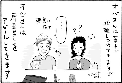 サイゾーウーマンカルチャーマンガ柿ノ種まきこ『アラサー独身女、今日も日雇いで生きてます』【漫画】肩書きをドヤるおっさん カルチャー 【連載】柿ノ種まきこ『アラサー独身女、今日も日雇いで生きてます』 【日雇いマンガ】71話『ドヤ顔おじさん登場! 反応にこまりすぎる珍行動とは……!?』 2019/10/31 13:00 柿ノ種まきこ 日雇いマンガ柿ノ種まき子 ――「キツイ」「汚い」「男臭い」……なんとなく近寄りがたいイメージのある“日雇労働”。その、実態はどのようなものなのか? 日雇い労働を生業とするアラサー・柿ノ種まきこが、日雇いの日々と人間模様を紹介します。 第71話『ドヤ顔おじさん登場! 反応にこまりすぎる珍行動とは……!?』 おばさんとおじさんの距離のつめ方の違い……。 どっちにしろ反応に困る〜! 対応してる間に今日も休憩時間が終わります……(涙) ――毎週、木曜日に最新話を更新。次回72話は年11月7日(木)の更新予定です。 柿ノ種まきこ/@kakinotane_makiko 日雇いをしながらマンガを描くアラサー。過去には、「iVERY」にて婚活マンガ『女もつらいよ』を連載。現在はインスタグラムにて、マンガを不定期投稿。 https://www.instagram.com/kakinotane_makiko/ ★LINEスタンプ大好評発売中! 購入はコチラから→『柿ノ種まきこの日雇いスタンプ』 最終更新:2019/10/31 13:00 関連記事 【日雇いマンガ】『アラサー独身女、今日も日雇いで生きてます』【36~42話まとめ読み】【日雇いマンガ】『アラサー独身女、今日も日雇いで生きてます』【29~35話まとめ読み】【日雇いマンガ】『アラサー独身女、今日も日雇いで生きてます』【22~28話まとめ読み】【日雇いマンガ】『アラサー独身女、今日も日雇いで生きてます』【15~21話まとめ読み】【日雇いマンガ】『アラサー独身女、今日も日雇いで生きてます』【8~14話まとめ読み】 その他の作品を読むバックナンバーを読む 次の記事 石田ゆり子「お金は紙」ビッグダディ元妻・美奈子「家族でYouTube配信」今週のオドロキ発言 >