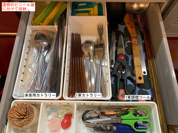 サイゾーウーマン暮らし住まいプロが選ぶのは断然「セリア」のワケ 暮らし 伊藤まきの「お片付けSOS」相談! プロが選ぶ「セリア」3アイテム! キッチン収納、間違いない“使える”お片付けテク 2019/11/25 19:30 伊藤まき 100均「お片付け・お掃除SOS」伊藤まき セリアのキッチントレーで「引き出し収納」は完璧! キッチンの引き出しなのに、[お悩み3]には工具と薬が入っています。空き箱やツールボックスを使っているので、完璧な収納ですが……。この場所なら、毎日使っているキッチングッズを置くほうが便利です。 ↓[After]↓ 小物収納は、細かく仕切れるほど便利で快適! キッチンに限らず、デスクや本棚の引き出しなどにも使い回しの効くセリアのキッチントレー ワイド(約W12×H5×D34.8cm)を使います。小物のサイズに合わせて付属の仕切り板で調整できます。しかも、セパレート型なので幅広い組み合わせも可能です。 キッチンツールは1軍グッズを厳選して! 使用頻度別で収納すれば、調理時間も時短できます。頻度別収納のポイントを説明します。 [Point]使用頻度(日常用と来客用/1軍と2軍)で分ける! 筆者宅では、1〜3軍に分けて収納しています キッチンで使うモノは、使用頻度がまったく異なります。例えば、調理ツールだけでも写真のように分かれます。Kさん宅の引き出し内も、使用頻度(日常用と来客用/1軍と2軍)で分けました。同じグループだからと、一箇所に収納しなくてもいいという例です。限られた場所だからこそ、1軍のモノだけを置くように工夫しましょう。 次のページ セリアのファイルスタンドで「転倒防止」! 前のページ123456次のページ 関連記事 玄関の「イラッ」を100均グッズで解決! 「傘立て」「全身鏡」をセリア&ダイソーでスッキリ収納100均「プラダン」で激変! 洗濯機、ホコリまみれの「防水パン」が3ステップで収納空間に「オキシクリーン」使い方! 簡単2ステップ「オキシ漬け」で“油汚れ・焦げ鍋”が衝撃スッキリ100均グッズで「深型引き出し」収納を極める! 書類・小物・薬のゴチャつき整理術「無印良品」のファイルが正解! 調味料・食品の“ムダなし”簡単収納テクニック