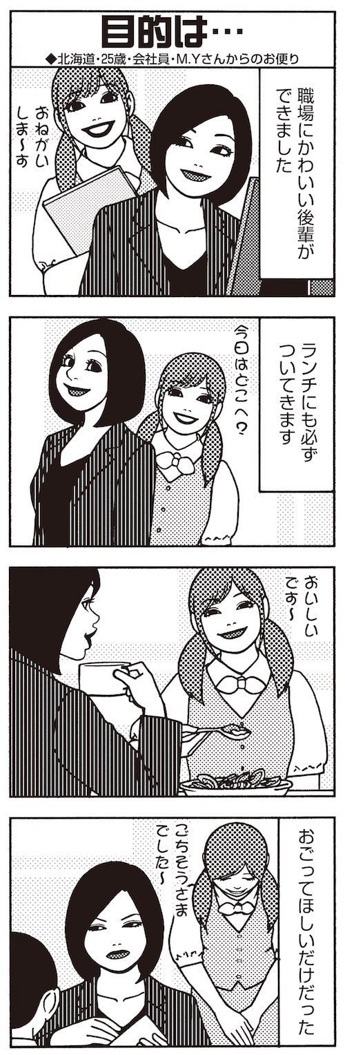 サイゾーウーマンカルチャーマンガ本当にあった笑える話【漫画】こびまくり後輩の思惑 カルチャー 『本当にあった笑える話』(ぶんか社より) 【漫画・激イラ話】「お供します〜!」ランチについてきて財布を絶対に出さないクソ後輩 2020/04/21 11:00 『本当にあった笑える話』編集部 マンガ漫画本当にあった笑える話 【「本当にあった笑える話」(ぶんか社)より】 ↓もっとマンガが読みたい方はコチラ↓ ぶんか社のコミックエッセイ・実話4コマ漫画が待てば無料で読める! スマホ向け漫画サイト『マンガよもんが』 『本当にあった笑える話』シリーズ誌では、みなさまからの投稿を随時募集しております。 テーマは「芸能人目撃談」「赤っ恥エピソード」「ペットトラブル」など幅広く募集中! →投稿は【こちらから】 最終更新:2020/04/21 14:58 突き放しても悪者になるやつ 関連記事 【漫画・衝撃トラブル】参列者ドン引き……ダメンズ女が最後に選んだ衝撃の伴侶とは!?【漫画・THE自業自得な女】寿退社の勝ち組女が一転! 職だけでなく婚約者まで失ったワケ【漫画・イライラMAXエピソード】「お先に失礼します〜」仕事をせず定時で上がるクソ新人【漫画・私の怒り心頭エピソード】殺してやりたい! H野源に似てると自称する男【漫画・友人トラブル】同居人が金をコソコソ盗み続けるクソ女でした。被害総額は…… その他の作品を読む 次の記事 二宮&風磨、“ジャニーズボイトレ事情”告白 >