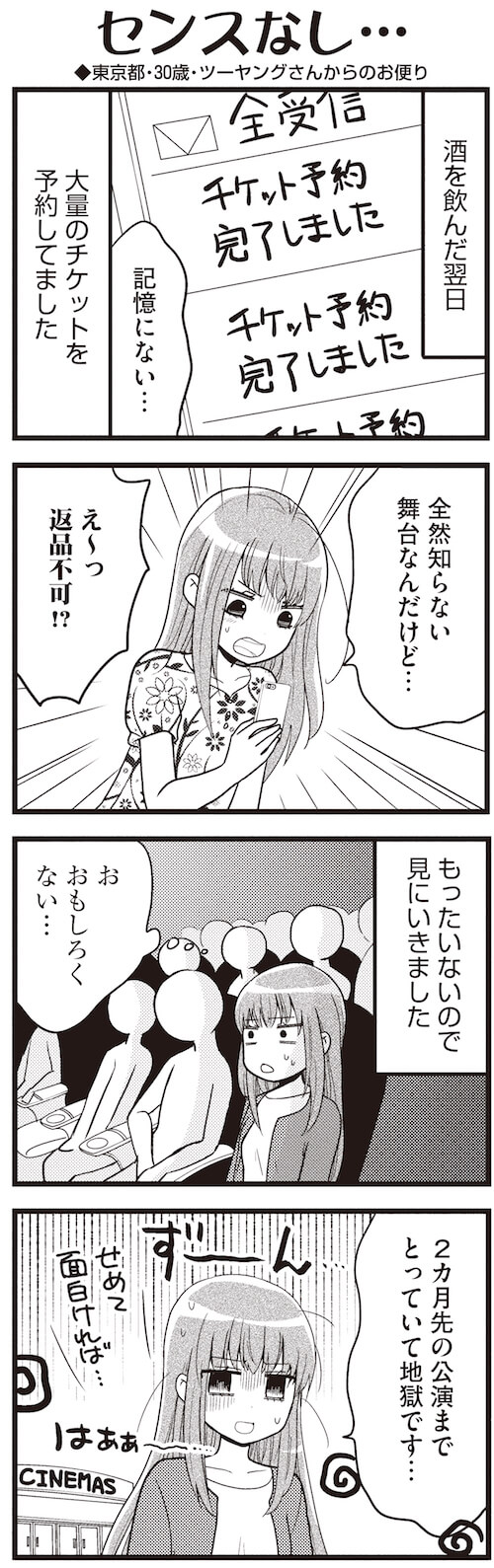 サイゾーウーマンカルチャーマンガ本当にあった笑える話【漫画】泥酔で全ステ制覇 カルチャー 『本当にあった笑える話』(ぶんか社より) 【漫画・やらかし事件簿】2ヶ月公演全通!? 見に覚えのない大量のチケット予約通知が…… 2020/04/30 11:00 『本当にあった笑える話』編集部 マンガ漫画本当にあった笑える話 【「本当にあった笑える話」(ぶんか社)より】 ↓もっとマンガが読みたい方はコチラ↓ ぶんか社のコミックエッセイ・実話4コマ漫画が待てば無料で読める! スマホ向け漫画サイト『マンガよもんが』 『本当にあった笑える話』シリーズ誌では、みなさまからの投稿を随時募集しております。 テーマは「芸能人目撃談」「赤っ恥エピソード」「ペットトラブル」など幅広く募集中! →投稿は【こちらから】 最終更新:2020/04/30 11:00 おもしろくないのが終わってる 関連記事 【漫画・衝撃トラブル】参列者ドン引き……ダメンズ女が最後に選んだ衝撃の伴侶とは!?【漫画・THE自業自得な女】寿退社の勝ち組女が一転! 職だけでなく婚約者まで失ったワケ【漫画・イライラMAXエピソード】「お先に失礼します〜」仕事をせず定時で上がるクソ新人【漫画・私の怒り心頭エピソード】殺してやりたい! H野源に似てると自称する男【漫画・友人トラブル】同居人が金をコソコソ盗み続けるクソ女でした。被害総額は…… その他の作品を読む 次の記事 宮迫、蛍原との会談スルー? >