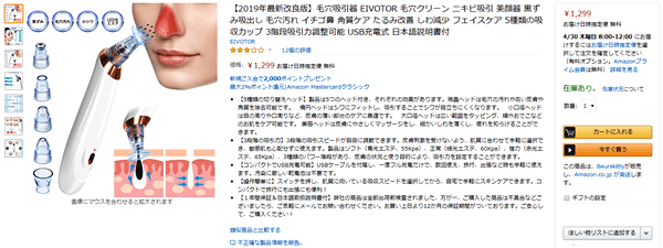 今回見つけたのは美顔器ジャンルの「毛穴吸引器」。星5つ中3.1を獲得していて、値段は1,299円というお手頃さ。試しに買ってみようとレビューを見てみると、くっきり評判が分かれていました。