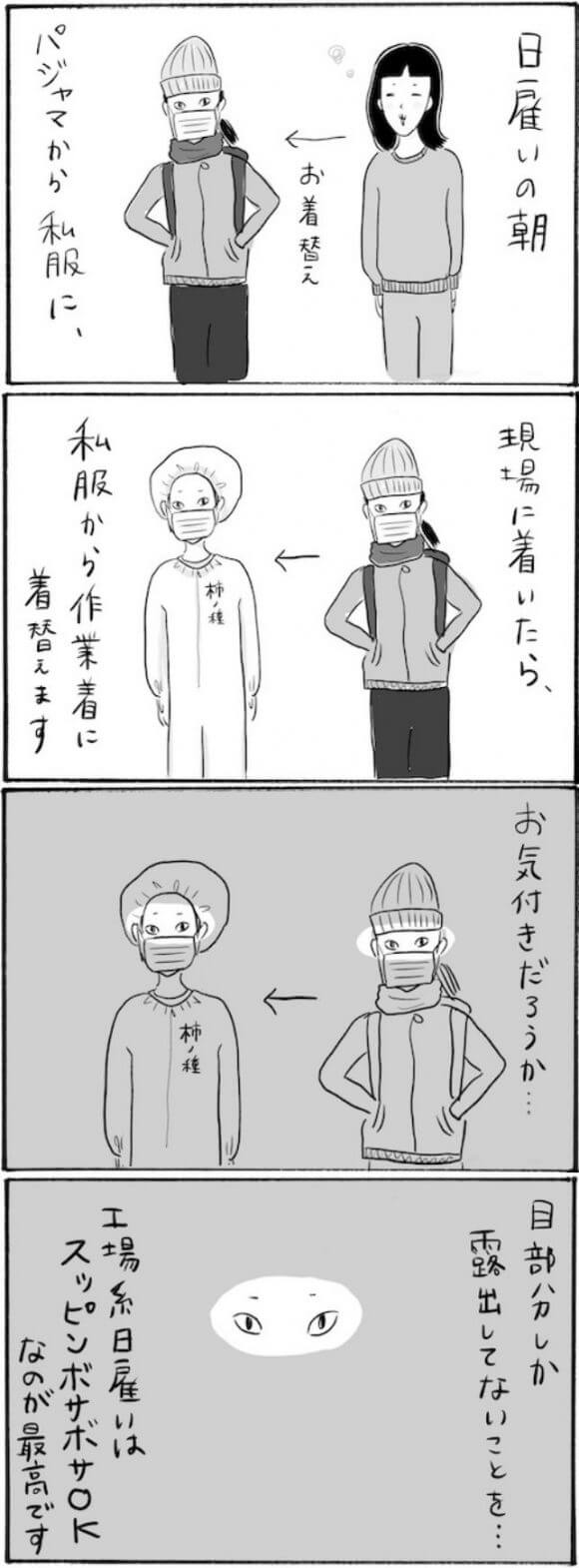 サイゾーウーマンカルチャーマンガ柿ノ種まきこ『アラサー独身女、今日も日雇いで生きてます』【日雇いマンガ】92~98話 カルチャー 【連載】柿ノ種まきこ『アラサー独身女、今日も日雇いで生きてます』 【日雇いマンガ】『アラサー独身女、今日も日雇いで生きてます』【92~98話まとめ読み】 2020/07/25 13:00 柿ノ種まきこ(マンガ家) マンガ柿ノ種まき子日雇い ――「キツイ」「汚い」「男臭い」……なんとなく近寄りがたいイメージのある“日雇労働”。その、実態はどのようなものなのか? 日雇い労働を生業とするアラサー・柿ノ種まきこが、日雇いの日々と人間模様を紹介します。 今回は92〜98話をまとめ読みでお送りいたします。 (1〜7話はこちら)(8〜14話はこちら) (15〜21話はこちら)(22〜28話はこちら) (29〜35話はこちら)(36〜42話はこちら) (43〜49話はこちら)(50〜56話はこちら) (57〜63話はこちら)(64〜70話はこちら) (71〜77話はこちら)(78〜84話はこちら) (85〜91話はこちら) 第92話『完全防備! スッピン女子の通勤スタイル』 ©柿ノ種まきこ どんなに寝癖がひどくても、どんなに肌荒れがひどくても、どんなに私服が変でも、 全て包み込んでくれる工場用の使い捨てつなぎが大好き……! 第93話『現場にまさかの〇〇○で登場!? 服装規定にまつわるトラブル』 ©柿ノ種まきこ 服装については本人が動きやすければそれでいいのかな〜とも思ったり……。 しかしネクタイやジャケットは荷物に引っかかったりする恐れもあるので、作業中は避けるべきかも知れません。 ハイネックや七分袖がNGの現場もあるので、作業前に服装について確認しておくのがおすすめです。 次のページ 94話『恐怖!! 作業終了とともに奇声と物音が響く怪現場』』 1234次のページ 関連記事 【日雇いマンガ】『アラサー独身女、今日も日雇いで生きてます』【36~42話まとめ読み】【日雇いマンガ】『アラサー独身女、今日も日雇いで生きてます』【29~35話まとめ読み】【日雇いマンガ】『アラサー独身女、今日も日雇いで生きてます』【22~28話まとめ読み】【日雇いマンガ】『アラサー独身女、今日も日雇いで生きてます』【15~21話まとめ読み】【日雇いマンガ】『アラサー独身女、今日も日雇いで生きてます』【8~14話まとめ読み】 その他の作品を読むバックナンバーを読む