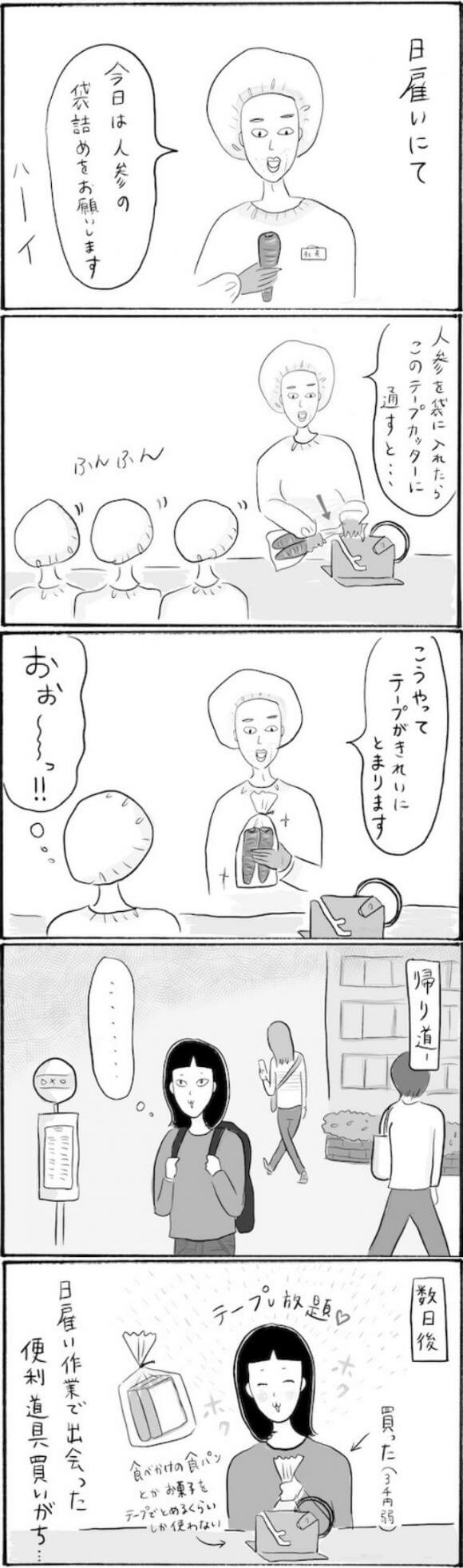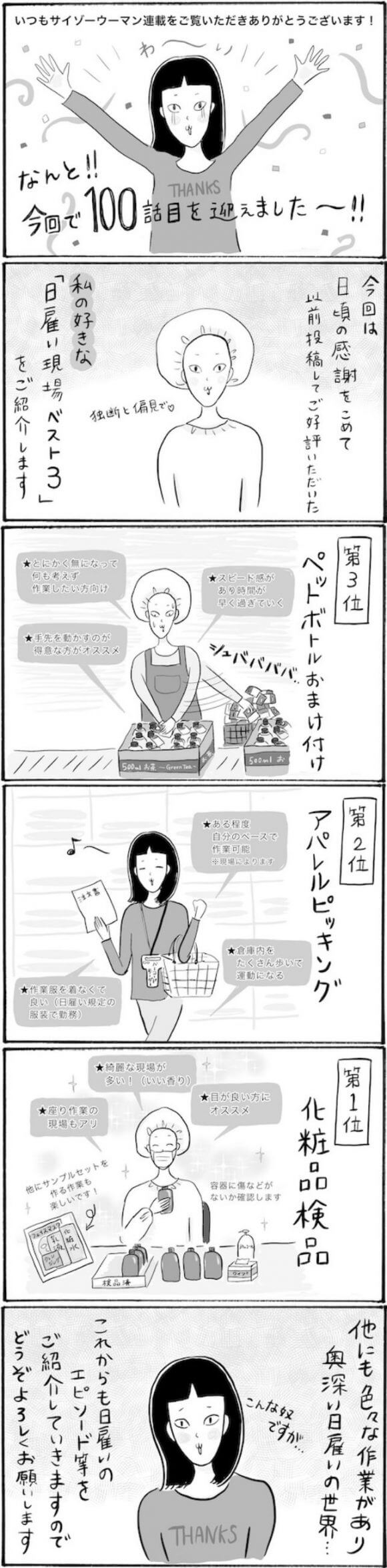 サイゾーウーマンカルチャーマンガ柿ノ種まきこ『アラサー独身女、今日も日雇いで生きてます』【日雇いマンガ】99~105話 カルチャー 【連載】柿ノ種まきこ『アラサー独身女、今日も日雇いで生きてます』 【日雇いマンガ】『アラサー独身女、今日も日雇いで生きてます』【99~105話まとめ読み】 2020/07/26 13:00 柿ノ種まきこ(マンガ家) マンガ柿ノ種まき子日雇い ――「キツイ」「汚い」「男臭い」……なんとなく近寄りがたいイメージのある“日雇労働”。その、実態はどのようなものなのか? 日雇い労働を生業とするアラサー・柿ノ種まきこが、日雇いの日々と人間模様を紹介します。 今回は99〜105話をまとめ読みでお送りいたします。 (1〜7話はこちら)(8〜14話はこちら) (15〜21話はこちら)(22〜28話はこちら) (29〜35話はこちら)(36〜42話はこちら) (43〜49話はこちら)(50〜56話はこちら) (57〜63話はこちら)(64〜70話はこちら) (71〜77話はこちら)(78〜84話はこちら) (85〜91話はこちら)(92〜98話はこちら) 第99話『ついつい買っちゃう! 便利グッズの落とし穴』 ©柿ノ種まきこ 日雇いの便利グッズ、ついつい気になっちゃうんですよね〜。 日常ではあんまり使わないものなのに結局買っちゃったりして無駄使い……! 第100話『日雇いのエキスパートが厳選! オススメ現場ベスト3』 ©柿ノ種まきこ ついに! 『アラサー独身女、今日も日雇いで生きてます』が100話を迎えました……! 始めた頃にはこんなにも連載が続くと思っていなかったのでとてもとても嬉しいです。 なんでも三日坊主の私が、漫画連載を続けられるのはご覧いただいてる皆さんのおかげです。 くだらない日雇いネタばかりですが、これからもどうぞよろしくお願いいたします! 次のページ 第101話『妻お手製の○○○でマウンティングし合う男たち〜前編〜』 1234次のページ 関連記事 【日雇いマンガ】『アラサー独身女、今日も日雇いで生きてます』【36~42話まとめ読み】【日雇いマンガ】『アラサー独身女、今日も日雇いで生きてます』【29~35話まとめ読み】【日雇いマンガ】『アラサー独身女、今日も日雇いで生きてます』【22~28話まとめ読み】【日雇いマンガ】『アラサー独身女、今日も日雇いで生きてます』【15~21話まとめ読み】【日雇いマンガ】『アラサー独身女、今日も日雇いで生きてます』【8~14話まとめ読み】 その他の作品を読むバックナンバーを読む