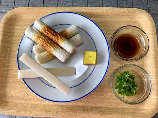 餅を長細く切らないといけないのかぁ、できるか? と不安だったが、便利な世の中になったもので、最初から長細くカットされた餅が売っていた! ポン酢・小ねぎ・バター・ちくわを準備しました。