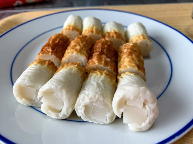 ちくわの穴が結構小さかったので、カットしてある餅をさらに半分に切った。なんとか、ちくわに入れ込み成功。