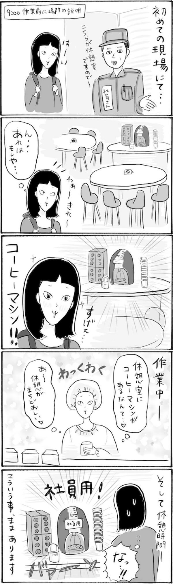 サイゾーウーマンカルチャーマンガ柿ノ種まきこ『アラサー独身女、今日も日雇いで生きてます』【漫画】会社の休憩室で感じる格差社会 カルチャー 【連載】柿ノ種まきこ『アラサー独身女、今日も日雇いで生きてます』 【日雇いマンガ】119話『分かっていたけど……某企業で目の当たりにした格差社会』 2020/10/01 13:00 柿ノ種まきこ(マンガ家) マンガ柿ノ種まき子日雇い ――「キツイ」「汚い」「男臭い」……なんとなく近寄りがたいイメージのある“日雇労働”。その、実態はどのようなものなのか? 日雇い労働を生業とするアラサー・柿ノ種まきこが、日雇いの日々と人間模様を紹介します。 第119話『分かっていたけど……某企業で目の当たりにした格差社会』 ©柿ノ種まきこ わかってた……わかってたよ。 何度も同じ経験してるのに、またぬか喜びしちゃいました……! ――毎週、木曜日に最新話を更新。次回120話は10月8日(木)の更新予定です。 柿ノ種まきこ(マンガ家) 日雇いをしながらマンガを描くアラサー。過去には、「iVERY」にて婚活マンガ『女もつらいよ』を連載。現在はインスタグラムにて、マンガを不定期投稿。 Instagram:@kakinotane_makiko LINEスタンプ大好評発売中! 最終更新:2020/10/01 20:09 関連記事 【日雇いマンガ】64話『肩身狭すぎ!? 某企業のオシャレ社員食堂で目の当たりにした格差』【日雇いマンガ】『アラサー独身女、今日も日雇いで生きてます』【85~91話まとめ読み】【日雇いマンガ】『アラサー独身女、今日も日雇いで生きてます』【92~98話まとめ読み】【1~8話まとめ読み】統合失調症にかかりました~にゃんside~【エッセイ漫画】【9~15話まとめ読み】統合失調症にかかりました~にゃんside~【エッセイ漫画】 その他の作品を読むバックナンバーを読む 次の記事 村上信五、「童貞ではない」と爆弾発言 >