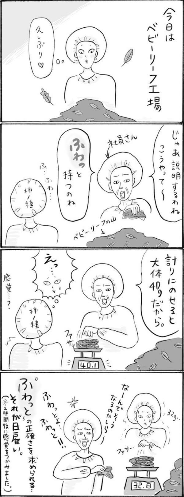 サイゾーウーマンカルチャーマンガ柿ノ種まきこ『アラサー独身女、今日も日雇いで生きてます』【漫画】ベテラン日雇いの奥義 カルチャー 【連載】柿ノ種まきこ『アラサー独身女、今日も日雇いで生きてます』 【日雇いマンガ】123話『全集中! 掴みしは適量のベビーリーフ~ベテランの奥義再び~』 2020/10/29 13:00 柿ノ種まきこ(マンガ家) 日雇いマンガ柿ノ種まき子 ――「キツイ」「汚い」「男臭い」……なんとなく近寄りがたいイメージのある“日雇労働”。その、実態はどのようなものなのか? 日雇い労働を生業とするアラサー・柿ノ種まきこが、日雇いの日々と人間模様を紹介します。 第123話『全集中! 掴みしは適量のベビーリーフ〜ベテランの奥義再び〜』 ©柿ノ種まきこ 「こうやって〜フワッとよ!」とか「ザクっと!」「シャッと!」と何かと効果音で作業を指示してくる社員さん……。わかるようなわからないような……!! ――毎週、木曜日に最新話を更新。次回124話は11月5日(木)の更新予定です。 柿ノ種まきこ(マンガ家) 日雇いをしながらマンガを描くアラサー。過去には、「iVERY」にて婚活マンガ『女もつらいよ』を連載。現在はインスタグラムにて、マンガを不定期投稿。 Instagram:@kakinotane_makiko LINEスタンプ大好評発売中! 最終更新:2020/10/29 13:00 関連記事 【日雇いマンガ】『アラサー独身女、今日も日雇いで生きてます』【78~84話まとめ読み】【日雇いマンガ】『アラサー独身女、今日も日雇いで生きてます』【85~91話まとめ読み】【日雇いマンガ】『アラサー独身女、今日も日雇いで生きてます』【92~98話まとめ読み】【1~8話まとめ読み】統合失調症にかかりました~にゃんside~【エッセイ漫画】【9~15話まとめ読み】統合失調症にかかりました~にゃんside~【エッセイ漫画】 その他の作品を読むバックナンバーを読む 次の記事 丸山隆平のクレーマーぶりがリアル!? >