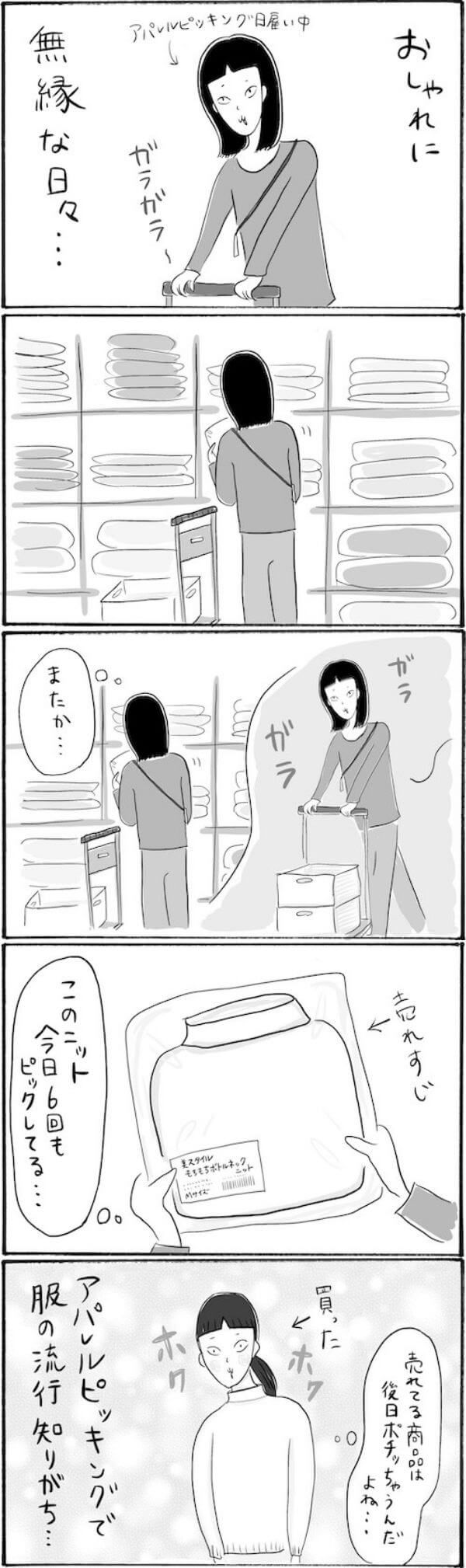 アパレルピッキングの作業は、 売れている服がどんどん出荷されるので、「こういうの流行っているんだ……!」と流行が知れて楽しいです。