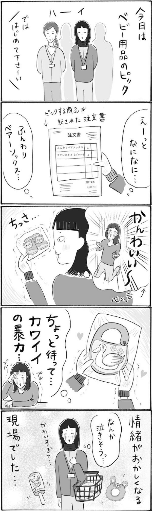 サイゾーウーマンカルチャーマンガ柿ノ種まきこ『アラサー独身女、今日も日雇いで生きてます』【漫画】ベビー用品で情緒不安定になる女 カルチャー 【連載】柿ノ種まきこ『アラサー独身女、今日も日雇いで生きてます』 【日雇いマンガ】131話『かわいすぎて涙が出る!? 情緒がおかしくなるプリティー現場』 2020/12/24 13:00 柿ノ種まきこ(マンガ家) マンガ柿ノ種まき子日雇い ――「キツイ」「汚い」「男臭い」……なんとなく近寄りがたいイメージのある“日雇労働”。その、実態はどのようなものなのか? 日雇い労働を生業とするアラサー・柿ノ種まきこが、日雇いの日々と人間模様を紹介します。 第131話『かわいすぎて涙が出る!? 情緒がおかしくなるプリティー現場』 ©柿ノ種まきこ ベビー用品のピックって、可愛い小さいアイテムばかりで癒しが止まらない!! なぜか情緒がおかしくなって何度かウルウルしてしまうアラサーでした(マスクを着用していますが漫画内では省略しています)。 ――毎週、木曜日に最新話を更新。次回132話は12月31日(木)の更新予定です。 柿ノ種まきこ(マンガ家) 日雇いをしながらマンガを描くアラサー。過去には、「iVERY」にて婚活マンガ『女もつらいよ』を連載。現在はインスタグラムにて、マンガを不定期投稿。 Instagram:@kakinotane_makiko LINEスタンプ大好評発売中! 最終更新:2020/12/28 19:39 関連記事 【日雇いマンガ】『アラサー独身女、今日も日雇いで生きてます』【78~84話まとめ読み】【日雇いマンガ】『アラサー独身女、今日も日雇いで生きてます』【85~91話まとめ読み】【日雇いマンガ】『アラサー独身女、今日も日雇いで生きてます』【92~98話まとめ読み】【1~8話まとめ読み】統合失調症にかかりました~にゃんside~【エッセイ漫画】【9~15話まとめ読み】統合失調症にかかりました~にゃんside~【エッセイ漫画】 その他の作品を読むバックナンバーを読む 次の記事 華原朋美「コンビニスイーツ爆食い」 >