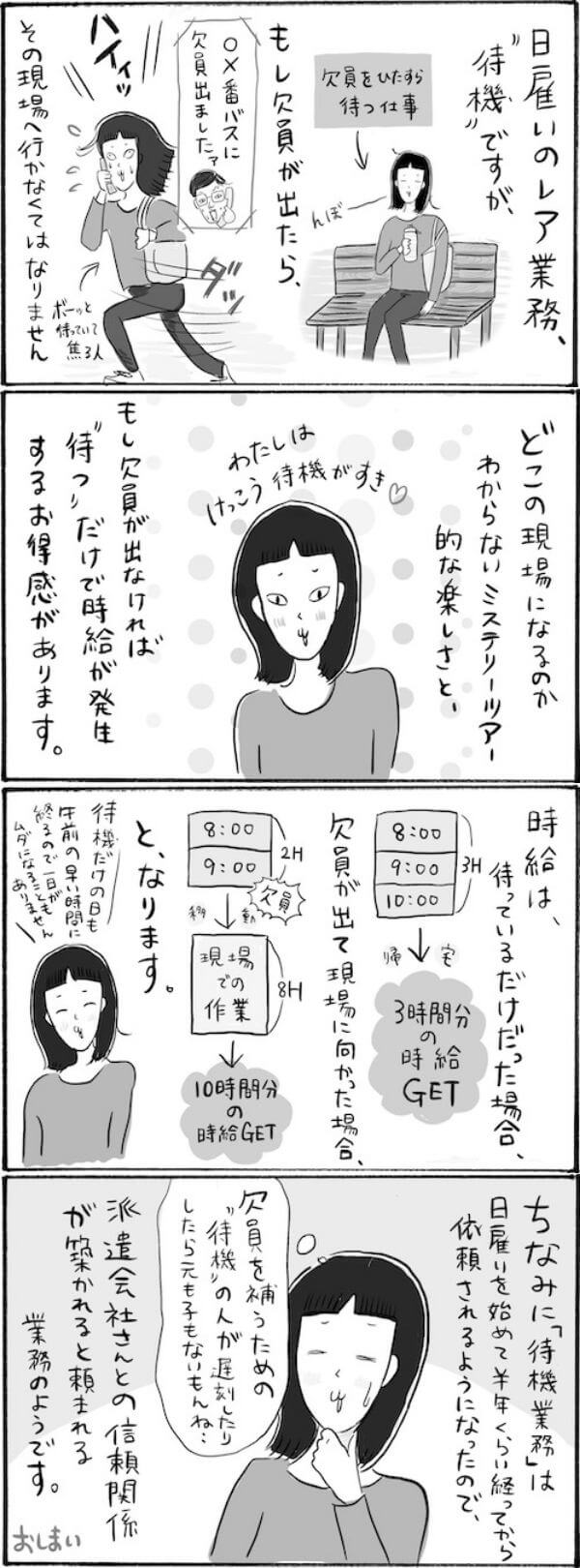サイゾーウーマンカルチャーマンガ柿ノ種まきこ『アラサー独身女、今日も日雇いで生きてます』【日雇いマンガ】113~119話 カルチャー 【連載】柿ノ種まきこ『アラサー独身女、今日も日雇いで生きてます』 【日雇いマンガ】『アラサー独身女、今日も日雇いで生きてます』【113~119話まとめ読み】 2021/01/02 13:00 柿ノ種まきこ(マンガ家) マンガ柿ノ種まき子日雇い ――「キツイ」「汚い」「男臭い」……なんとなく近寄りがたいイメージのある“日雇労働”。その、実態はどのようなものなのか? 日雇い労働を生業とするアラサー・柿ノ種まきこが、日雇いの日々と人間模様を紹介します。 今回は113~119話をまとめ読みでお送りいたします。 (1~7話はこちら)(8~14話はこちら)(15~21話はこちら) (22~28話はこちら)(29~35話はこちら)(36~42話はこちら) (43~49話はこちら)(50~56話はこちら)(57~63話はこちら) (64~70話はこちら)(71~77話はこちら)(78~84話はこちら) (85~91話はこちら)(92~98話はこちら)(99~105話はこちら) (106~112はこちら) 第113話『今日の仕事は……待ってるだけ!? 激レア仕事レポート』 ©柿ノ種まきこ 派遣会社からたまに依頼される 「待機」というレア業務。 仕事の準備をして駅に向かう面倒くささはありますが、 早起きして、ぼーっとしてそのまま欠員が出ずに帰宅! (朝10時頃)となると、朝一番に一仕事終えた感があり、 とっても1日を有意義に過ごせた気分になるんですよね。 待機業務が早く終わった日は、帰って家業の手伝いをしたりしています。 (※現在移動中などはマスクをしていますが、漫画内では割愛しています。) 第114話『今日の仕事は……待ってるだけ!? 激レア仕事レポート~後編~』 ©柿ノ種まきこ 待機業務、私は結構好きです。ちなみに待機から、欠員が出て業務に向かう割合は8(直帰):2(作業場)くらいです。 私の働いている場所では、ほとんど直帰する事になりますが やっぱり待ってるだけで時給が出るのは魅力ですね。 (※日雇い中などはマスクをしていますが、 漫画内では割愛しています。) 次のページ 第115話『あなたはどのタイプ? 日雇いに向いてる人診断』 1234次のページ 関連記事 【日雇いマンガ】『アラサー独身女、今日も日雇いで生きてます』【36~42話まとめ読み】【日雇いマンガ】『アラサー独身女、今日も日雇いで生きてます』【29~35話まとめ読み】【日雇いマンガ】『アラサー独身女、今日も日雇いで生きてます』【22~28話まとめ読み】【日雇いマンガ】『アラサー独身女、今日も日雇いで生きてます』【15~21話まとめ読み】【日雇いマンガ】『アラサー独身女、今日も日雇いで生きてます』【8~14話まとめ読み】 その他の作品を読むバックナンバーを読む