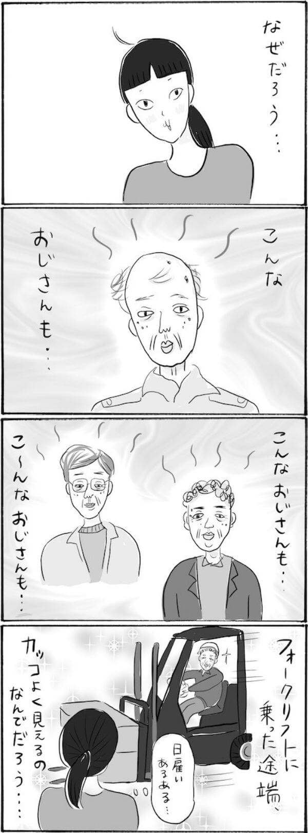 サイゾーウーマンカルチャーマンガ柿ノ種まきこ『アラサー独身女、今日も日雇いで生きてます』【漫画】現場でおじさん萌え!? カルチャー 【連載】柿ノ種まきこ『アラサー独身女、今日も日雇いで生きてます』 【日雇いマンガ】136話『キュンです!? 現場で輝くおじさんたちの秘密』 2021/01/28 13:00 柿ノ種まきこ(マンガ家) 日雇いマンガ柿ノ種まき子 ――「キツイ」「汚い」「男臭い」……なんとなく近寄りがたいイメージのある“日雇労働”。その、実態はどのようなものなのか? 日雇い労働を生業とするアラサー・柿ノ種まきこが、日雇いの日々と人間模様を紹介します。 第136話『キュンです!? 現場で輝くおじさんたちの秘密』 ©柿ノ種まきこ どんなおじさんでも、 なぜだかフォークリフトを乗りこなしてると格好よく見えるんですよねぇ。 日雇いあるあるですかね……? ――毎週、木曜日に最新話を更新。次回137話は2月4日(木)の更新予定です。 柿ノ種まきこ(マンガ家) 日雇いをしながらマンガを描くアラサー。過去には、「iVERY」にて婚活マンガ『女もつらいよ』を連載。現在はインスタグラムにて、マンガを不定期投稿。 Instagram:@kakinotane_makiko LINEスタンプ大好評発売中! 最終更新:2021/01/28 13:00 関連記事 【日雇いマンガ】『アラサー独身女、今日も日雇いで生きてます』【78~84話まとめ読み】【日雇いマンガ】『アラサー独身女、今日も日雇いで生きてます』【85~91話まとめ読み】【日雇いマンガ】『アラサー独身女、今日も日雇いで生きてます』【92~98話まとめ読み】【1~8話まとめ読み】統合失調症にかかりました~にゃんside~【エッセイ漫画】【9~15話まとめ読み】統合失調症にかかりました~にゃんside~【エッセイ漫画】 その他の作品を読むバックナンバーを読む 次の記事 100均ボトルラック対決 >