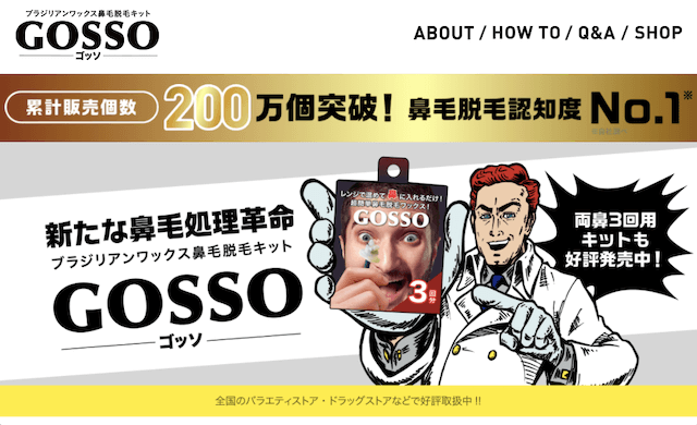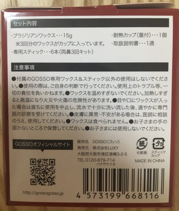 サイゾーウーマン暮らし100均・雑貨鼻毛がとんでもない量抜ける「GOSSO」 暮らし トレンド商品ガチレビュー 鼻毛が「とんでもない量抜ける」と話題の「GOSSO」、やってみた! がっつり抜ける興奮ポイントと注意点 2021/03/05 14:30 tukki(ライター) トレンド 大ヒットアイテムを実際に使用し、その使い心地を購入者目線でレビューします!今回はSNSで話題、大人気のブラジリアンワックス鼻毛脱毛セット「GOSSO」を検証します。 「GOSSO」とは? GOSSO公式サイトより SNSで話題のブラジリアン鼻毛脱毛ワックス「GOSSO」。お手頃価格で購入できるのに、効果抜群なんだとか! これさえあればもう鼻毛の面倒なお手入れも必要なく、1カ月に1回「GOSSO」を使用するだけでOK。メーカー欠品をおこしている商品もあるほど、密かに大人気のアイテムなんです。 Twitterでも使用後の写真が多くあげられ、「とんでもない量抜ける」と話題になっていました。YouTubeにも「GOSSO」を使用した動画が多くアップされています。 「GOSSO」買ってみました! 表はインパクトの強いパッケージです! 本当に写真のようになるのでしょうか?(C)サイゾーウーマン 今回使うのは、「GOSSO」3回分キットです。定価は780円(税抜)。 10回分キットと3回分キットがありますが、1回分あたりの金額3回分は260円/回、10回分は180円/回で、10回分のほうがお得です。バラエティショップやドラッグストアでも購入できるそうですが、近隣の店では売り切れていたため、ネットにて購入しました。箱のサイズは思ったよりも小さく、縦8×横7×高さ4.5(cm)でした。 こちらは裏面です。MADE IN CHINAでした。(C)サイゾーウーマン 中身を見ていきます。中には4点入っていました。 中身(C)サイゾーウーマン 1. 説明書 2. 専用スティック 3. 追加用ワックス 4. 耐熱カップ(蓋・紙カップ付き/ワックスの一部はカップ内に装填済) ※ワックスは合計15g入っています。 次のページ 「GOSSO」の使用してみました! 1234次のページ 関連記事 「洗濯マグちゃん」だけで、ホントに汚れが落ちるのか検証レビュー! しょうゆ他シミ汚れでテストした驚きの結果は……話題のコスメ「The Ordinary」を試してみた! 人気「血みどろピーリング」は要注意!? 肌荒れ・皮むけの結果にメルカリ商品の発送手続きがわずか1分で! ローソンの荷物発送サービス「スマリボックス」が簡単&時短で超便利温泉の専門家が選ぶ「入浴剤」ランキングベスト5! コンビニ・ドラストで買える“本格温泉”今冬1位は!?大阪・激安スーパー「玉手」初体験ルポ! チラシの「1円」商品、エコバッグ他1,000円でこんなに買えた!