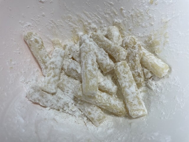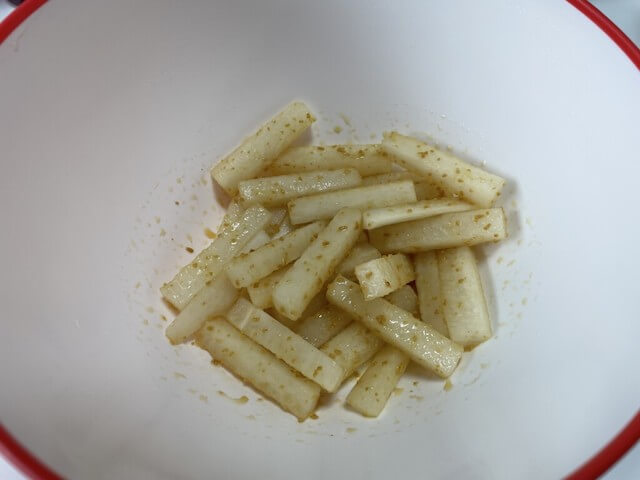 サイゾーウーマン暮らし食べ物【フライドダイコン】大根嫌いの子どもにも◎ 暮らし 【あのツイッターレシピ、やってみました】 バズレシピ・リュウジさん【フライドダイコン】、冷めてもおいしいコンソメ味の“おやつ感”! 大根嫌いの子どもたちもパクパク完食した! 2021/03/03 18:30 アウちゃん(ライター) ツイッターレシピ、やってみました 片栗粉は厚めに、しっかりと! コンソメを入れて大根に下味をつけていきます。よくもむと水分が出てきて、コンソメの味が浸透しやすくなるようなので、よく揉み込みました。 しっかり揉み込んだ(C)サイゾーウーマン リュウジさんが、フライドダイコンの衣になる片栗粉は、結構厚めにつけたほうがいいと言っていたので、たっぷり目につけてみた。 がっつり片栗粉をつける(C)サイゾーウーマン 1センチほどの油を使い、中火でダイコンを揚げていきます。 大根でも意外と表面カリッと揚がるんだな〜と発見。 揚げ焼きでOK(C)サイゾーウーマン 完成です! 見た目ポテトフライなんですけど、中身は大根。 好みで塩を少々かけました。 完全にフライドポテトの見た目(C)サイゾーウーマン 熱々の出来立てがおいしいそうなので早速食べてみることにしました。 次のページ コンソメ味のおやつ感覚! 前のページ123次のページ 関連記事 山本ゆりさん「白菜ツナサラダ」、子ども喜ぶ白菜消費レシピで「誰がこんなに食べるねん」問題も解決!【日雇いマンガ】『まきこの簡単クッキング~アラサー農家直伝! 大根大量消化レシピ~』バズレシピ・リュウジさん【至高の豚汁】普通の豚汁と思って作ったら絶句した! 夫も優しく微笑んだ!バズレシピ【ラー飯】、ラーメン&ご飯の“お焦げ”は想像超えるウマさ!! 付属調味料の味付けが絶妙すぎバズレシピ【最強のソース唐揚げ】はホントに最強!? 料理できない主婦が作ったら……簡単すぎてウマすぎて止まらない!