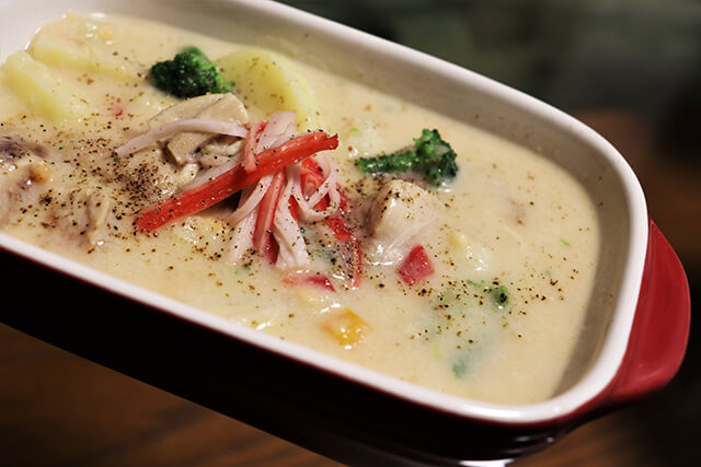 サイゾーウーマン暮らし食べ物業務スーパー史上最大のセール大活用 暮らし 布川隼汰が「業務用スーパーで100円レシピ」作ってみた! 「業務スーパー史上最大」のセールを大活用! 業スーマニアの絶対買いは「北海道便 メンチカツ」、サクサク具合が高クオリティ 2021/03/11 18:00 布川隼汰(俳優) 料理業務用スーパー100円レシピ 【カニクリームコロッケシチュー】 (C)布川隼汰 (材料) クリーミーコロッケかに……1個 27円 調整豆乳……100ml 14円 ブラジル産鶏もも肉……50g 17円 冷凍ポテト……50g 12円 彩りサラダ野菜ミックス……50g 18円 サラダスティック……1本 5円 水……150cc 0円 ●鶏だしの素……小さじ1 2円 ●塩胡椒……少々 1円 合計96円 1.解凍したクリームコロッケと豆乳を加熱した鍋に同時に入れ、コロッケを潰しながら混ぜる。 2.サラダスティック以外の具材と調味料を鍋に加え、弱火〜中火で10分ほどふたをして煮ていく。 3.鶏肉に火が通ったらお皿に盛り付けて、サラダスティックをほぐして散らせば完成! ◎ワンポイント ・1の行程で火をかけすぎると焦げ付くので、しっかり鍋の前で混ぜながら加熱してください! ◎感想 以前この連載で紹介した、業スーのクリームコロッケ。こういった冷凍コロッケって、なぜかハンパに1個だけ余るんですよね。しかもその1個のためにわざわざ油を大量に使うのも面倒……。というときに半分ヤケで思いついたシチュー作戦! クリームがホワイトソースの代わりに、そしてパン粉もソースのトロみに一役買ってくれます。何よりカニの風味が勝手についてくれるのが最高! そしてセールで購入したサラダスティックのおかげで、見た目も味もさらに「カニ」に。これで冷凍コロッケが残るのも怖くないです。ほとんど冷凍品で仕上げられるのも高得点。 次のページ 【無限ポテチキャベツ(ガーリック)】 前のページ1234次のページ 関連記事 業務スーパー謎の冷凍食品「イカしたボール」の正体! 「期待を裏切られた」業スーマニアが実食レビュー&おつまみ考案業務スーパーパスタは500g/87円の1.6mmが高コスパ&超万能! 濃厚豆乳クリームなど絶品パスタがほぼ100円で業務スーパーマニア激推し「豚焼肉たれ漬け」で、甘口派にピッタリな“ガッツリ系肉丼”レシピ業務スーパー目玉商品で、豚の“姜葱醤”焼き! ただの生姜焼きとは違う「旨味ギュ~ッ」の絶品完成!!業務スーパーで作る「無限ピーマン」秒速レシピ! 歯ごたえ抜群&味付けは「鶏だしの素」で間違いなし!!