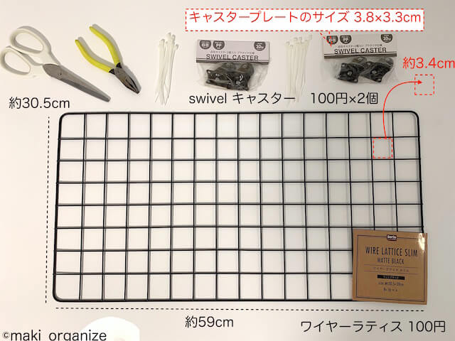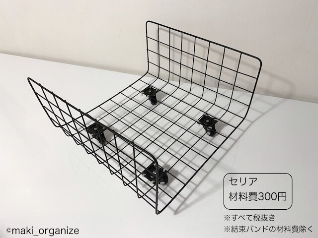 サイゾーウーマン暮らし住まい“絶対便利”な荷台を収納のプロが伝授 暮らし 伊藤まきの「お片付けSOS」相談! セリアとダイソーなら5分で完成! 「絶対便利」なキャスター付き荷台の作り方を収納のプロが解説 2021/04/05 19:30 伊藤まき(収納ライター) 「お片付け・お掃除SOS」伊藤まき [セリア]300円で作るオシャレなキャスター付き荷台 オールマットブラックで見栄えも◎(C)maki_organize セリア版の完成品です! 使ったのはセリアで販売されている材料だけです。マットブラックのワイヤーネットとキャスターの組み合わせで、生活感を排除したデザイン。 次に、用意する材料と作り方を説明します。 [セリア]キャスター付き荷台の材料 ワイヤー、キャスターを艶なしブラックで揃えました(C)maki_organize セリアの「ワイヤーラティス マットブラック(100円)」を1枚。艶無し黒の「SWIVEL キャスター(100円)」2個を用意。筆者手持ちの結束バンド(10cm)は、半透明になります。 真っ黒にこだわりたい方は、結束バンド(黒)を用意するとオシャレ感もアップします。 [セリア]キャスター付き荷台の作り方1:キャスタープレートのサイズに注意! ワイヤーを覆うサイズのプレートが◎(C)maki_organize キャスターを直に付ける場合は、ワイヤーの四角サイズより大きなサイズのキャスタープレートを選ぶようにします。今回は、ギリギリのサイズ(3.8×3.3cm)なので、着脱しないように強く固定しています。 次のページ [セリア]キャスター付き荷台の作り方2:ワイヤーを優しく折り曲げる 前のページ123456次のページ 関連記事 キッチン収納、劇的ビフォーアフター12連発! 整理収納のプロが「100均グッズ」だけで手直し&解説収納のプロがニトリ・無印良品より「コーナン」を選んだ理由! コスパ最強「小物整理」2アイテムプロに学んだ大人気「ウタマロクリーナー」の5つの使い方! オキシクリーンも重曹もいらない大掃除テクニックを伝授収納のプロが10年試した、100均グッズ「決定版」! 使いにくい「洗面台の鏡裏」スッキリ片付く7アイテムダイソーなら激安で再現可能! 収納のプロが伝授、“100均マグネット”を使った壁面収納術