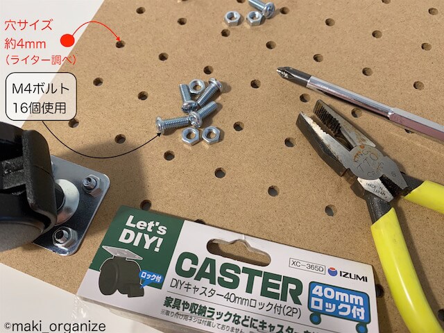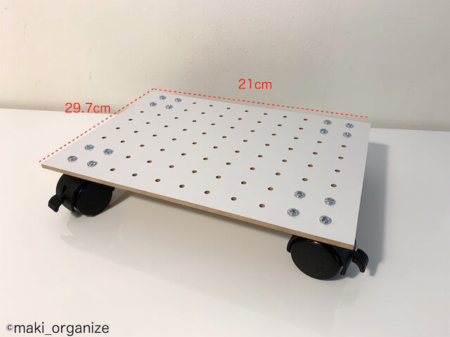 サイゾーウーマン暮らし住まい“絶対便利”な荷台を収納のプロが伝授 暮らし 伊藤まきの「お片付けSOS」相談! セリアとダイソーなら5分で完成! 「絶対便利」なキャスター付き荷台の作り方を収納のプロが解説 2021/04/05 19:30 伊藤まき(収納ライター) 「お片付け・お掃除SOS」伊藤まき [セリア]木材で作るナチュラルなキャスター付き荷台 ナチュラルな雰囲気に(C)maki_organize こちらも完成品から! 無機質なワイヤーや結束バンドを使わずに、木材とボルトで作りました。こちらも、ドライバーだけで作ることができます。 [セリア]木材キャスターの材料と作り方:キャスター40mmが木材にぴったり! ナットレンチやペンチ(100均にあり)で強く締める(C)maki_organize セリアの「ホワイトパンチングボード (100円)」を1枚。「DIYキャスター 40mmロック(100円)」2個を用意しました。キャスタープレートのサイズは、約3.8cm角(ライター調べ)になります。キャスター40mmが、パンチングボードの穴にぴったり入ります。 また、ボルトとナットは筆者手持ちの「M4サイズ」を用意しました。100均だとミックスセットで購入できます。ホームセンターのバラ売りのほうが、必要数とベストサイズで購入できます。 [使用例]ミニ家電用のラックにおすすめ どかすときに手間がかかる物におすすめ(C)maki_organize 床に直置きしている、ミニ家電におすすめ。また、掃除機をかけるときにどかす手間がかかるゴミ箱なども◎。ちなみに、ペットボトルの段ボールは、重たすぎてキャスターの動きが鈍くなります。 次のページ [まとめ]キャスター付き荷台は、今の時代に絶対便利! 前のページ123456次のページ 関連記事 キッチン収納、劇的ビフォーアフター12連発! 整理収納のプロが「100均グッズ」だけで手直し&解説収納のプロがニトリ・無印良品より「コーナン」を選んだ理由! コスパ最強「小物整理」2アイテムプロに学んだ大人気「ウタマロクリーナー」の5つの使い方! オキシクリーンも重曹もいらない大掃除テクニックを伝授収納のプロが10年試した、100均グッズ「決定版」! 使いにくい「洗面台の鏡裏」スッキリ片付く7アイテムダイソーなら激安で再現可能! 収納のプロが伝授、“100均マグネット”を使った壁面収納術