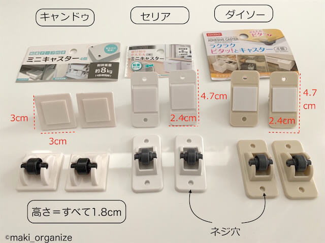ダイソーの「ラクラクピタッ! とキャスター」をはじめ、セリアの「取り付けかんたんミニキャスター」、キャンドゥの「粘着テープ付き ミニキャスター」のサイズを比較してみました。