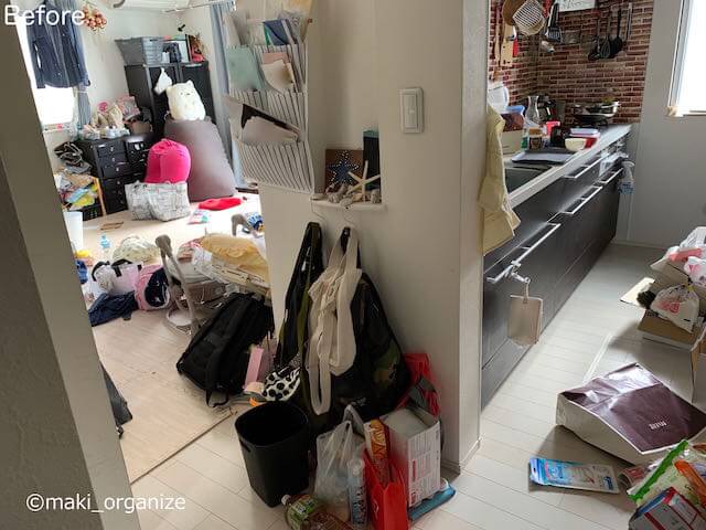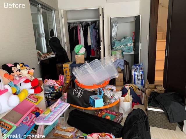 サイゾーウーマン暮らし住まい「誰にも見られたくない」汚家(おうち)、劇的ビフォー・アフター【1】――0歳7歳の育児と仕事で家が片付かない! 暮らし [連載]30代女子の「煩悩部屋」ビフォーアフター 「誰にも見られたくない」汚家(おうち)、劇的ビフォー・アフター【1】――0歳7歳の育児と仕事で家が片付かない! 2021/05/03 19:30 伊藤まき(収納ライター) 「汚部屋」ビフォーアフター [悩み2]クローゼット:憧れの「ファミクロ」が、機能していない [1階ファミクロ]換気の悪い部屋(S)でカビが出やすい 「日当たりの悪い部屋を活用するため、1階にファミリークローゼットを作りました。理想とは違って、うまく機能せず散らかり放題です。しかもカビがすごくて……」とKさん。結局、1階に降りるのが面倒で、よく着る服は2階に置きっぱなしだそう。この部屋を片付けるべきかどうかわからないまま放置しているそう。 <伊藤まきの答え> 3階建ての家に「ファミクロ」を設けるのは難しいので「部屋の目的」を変更します。玄関に近い1階の部屋は、買ったモノをそのまま置ける「生活クローゼット」に変更すると便利です。 [悩み3]プレイルーム:来客を招きたい [1階プレイルーム]長女さんのおもちゃが7年分ありました 「深い付き合いのないお客様が来たときに、ここでお迎えできればと思って作った部屋です。ところが、物置き小屋になってしまいました」とKさん。よく観察すると、娘さんの年齢より低いおもちゃもあります。第二子誕生の今まで、7年分のおもちゃが眠っていました。 <伊藤まきの答え> 娘さんも、小学校2年生になりますから「自分で要不要」の判断ができます。自分の部屋ができれば、片付けや支度の意欲が増すかも。一緒に片付けて、必要なモノだけに絞り1カ所にまとめましょう。 [悩み4]リビング:0歳のハイハイが始まる前に、安全な家にしたい [2階リビング]スティホームで、モノが一気に増えました 「床の小物は、育児グッズと娘の遊び道具です。片付けてもすぐ散らかるので諦めてしまいました」とKさん。お話を聞いたところ、妊娠中はつわりがひどく仕事も多忙で何の準備もできなかったそう。出産後に一息する時間が持てると思いきや、赤ちゃんに付きっきりで1日が終わるとか。 <伊藤まきの答え> 育児中の散らかりは「あって当然」で考えて、「元に戻しやすい仕組み」に改善します。コロナ禍で増えた、衛生品や食材の貯蓄は「出し入れしやすい収納」に変えましょう。 次のページ [悩み5]キッチン:SNSの収納アイデアを参考にしても片付かない 前のページ1234次のページ 関連記事 48時間で汚部屋スッキリ! 劇的ビフォーアフターで解説、「片付く家になる10ポイント」汚部屋ビフォー・アフター、衝撃5連発! 収納のプロが教える「片付く家になる10ポイント」不用品を溜め込んだ「ガラクタ部屋」が劇的スッキリ! 収納のプロが解説、“今すぐ”片付けるべき3つの理由今こそ除菌掃除! プロが伝授「オキシクリーン」で汚れゴッソリ、キッチン・浴室丸ごと掃除術狭くてイラッ、不快な「洗面室」をプロがスッキリ片付け! 6つの劇的ビフォー・アフター例