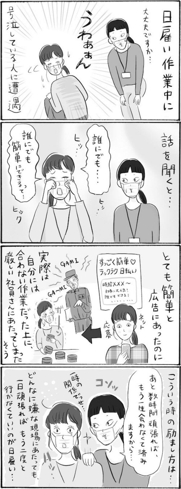 サイゾーウーマンカルチャーマンガ柿ノ種まきこ『アラサー独身女、今日も日雇いで生きてます』【漫画】日払い求人の理想と現実 カルチャー 【連載】柿ノ種まきこ『アラサー独身女、今日も日雇いで生きてます』 【日雇いマンガ】152話『誰でも簡単は本当!? 日払い求人広告と現場のギャップとは……』 2021/05/20 13:00 柿ノ種まきこ(マンガ家) 日雇いマンガ柿ノ種まき子 ――「キツイ」「汚い」「男臭い」……なんとなく近寄りがたいイメージのある“日雇労働”。その、実態はどのようなものなのか? 日雇い労働を生業とするアラサー・柿ノ種まきこが、日雇いの日々と人間模様を紹介します。 第152話『誰でも簡単は本当!? 日払い求人広告と現場のギャップとは……』 ©柿ノ種まきこ 広告があまりにも「簡単でラク!」みたいな謳い文句だと、 実際の作業とのギャップを感じてしまう人もいるようです。 嫌な現場に当たってしまっても、今日が終わればまた別の現場に行けるのが日雇いの良いところ。 二度と同じ現場になりたくなければ、派遣会社に伝えて次回からその現場も外してもらうこともできます。 色々な現場を試して、自分に合う作業を見つけられるのが日雇いの良いところですね! ※漫画内では表現上省略している場面がありますが、作業中はマスクをしています。 ――毎週、木曜日に最新話を更新。次回153話は5月27日(木)の更新予定です。 柿ノ種まきこ(マンガ家) 日雇いをしながらマンガを描くアラサー。過去には、「iVERY」にて婚活マンガ『女もつらいよ』を連載。現在はインスタグラムにて、マンガを不定期投稿。 Instagram:@kakinotane_makiko LINEスタンプ大好評発売中! 最終更新:2021/05/20 13:00 関連記事 【日雇いマンガ】『アラサー独身女、今日も日雇いで生きてます』【8~14話まとめ読み】【日雇いマンガ】『アラサー独身女、今日も日雇いで生きてます』【1~7話まとめ読み】【1~8話まとめ読み】統合失調症にかかりました~にゃんside~【エッセイ漫画】【9~15話まとめ読み】統合失調症にかかりました~にゃんside~【エッセイ漫画】 その他の作品を読むバックナンバーを読む 次の記事 ギミックも楽しめる100均の“車系おもちゃ” >