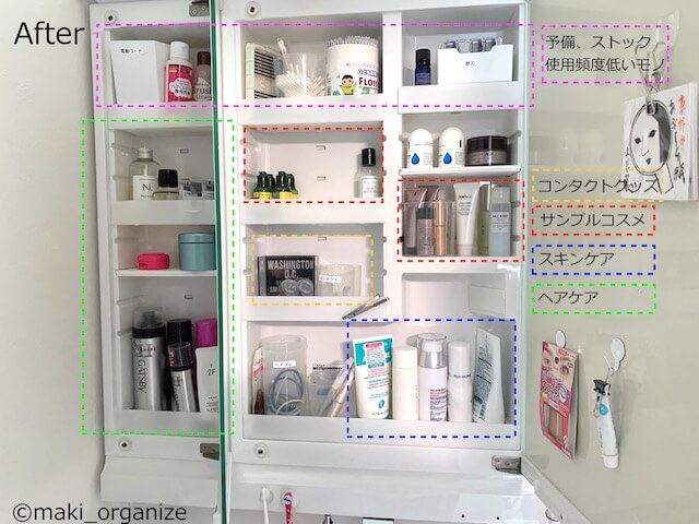 サイゾーウーマン暮らし住まい全部100均で洗面台を片付け 暮らし [連載]30代女子の「煩悩部屋」ビフォーアフター 洗面台収納の悩みは、「100均」で全部解決! 家族4人分のアイテムが劇的に片付くビフォー・アフター【3】 2021/05/17 19:30 伊藤まき(収納ライター) 「汚部屋」ビフォーアフター After[解決策]種類や目的別に分けるほど、使いやすくなる! 種類別にするだけで、使い忘れもブロック!(C)maki_organize 使う目的が同じモノを、ゾーン別に分けて収納しました。左側にヘアケアグッズを置くことで、中央の鏡でヘアセットができます。 使用頻度の低いモノ、ストック類は上段にまとめました。埋もれやすい小物は、扉裏に吊るします。そのほか、小物が埋もれない工夫も用意しました。 After[ポイント1]凹型トレイは逆さまに設置 ぜんぶ「見える」ほど、使いやすくなる!(C)maki_organize 凹型トレイに小物が埋もれないように収納しました。ポイントはこの3つ。 [1]トレイを逆さまに設置して底面をフラットに [2]セリアのプラダンを使って追加板を設置 [3]綿棒の空ケース(透明)にサンプルコスメをまとめ置き そのほか、小さな使い切りの小物は、扉の内側に吊り下げています。 After[ポイント2]プラダンで追加棚を設置 プラダンをハサミで切っただけ(C)maki_organize 付属の凹型・可変トレイを、使わないという選択もアリです。写真上のように、セリアのプラダンを2枚重ねれば「可動板」になります。もっと強度が欲しい場合は、アクリル板や木材なども◎。 そのほか、ヘアピンやミニチューブなどは、100均の「ミニポケット」「ミニフック」がおすすめです。詳細は、過去記事まとめへ。 ▼過去記事のまとめ▼ 収納のプロが10年試した、100均グッズ「決定版」! 使いにくい「洗面台の鏡裏」スッキリ片付く7アイテム整理収納アドバイザー1級で収納ライターの伊藤まきが、家の中の “片付かない”ちょっとした悩みを“簡単で安く”解決するコツを提案します! 今回のテーマは、「洗面台の鏡裏」...サイゾーウーマン2020.11.23 残り3つのお悩みも解決していきます! 次のページ Before[悩み2]歯ブラシの置き場が定まらない 前のページ12345次のページ 関連記事 脱衣所の収納が使いにくくてイライラ! 家族のパジャマと下着をスッキリ収納、劇的ビフォー・アフター【2】汚部屋ビフォー・アフター、衝撃5連発! 収納のプロが教える「片付く家になる10ポイント」狭くてイラッ、不快な「洗面室」をプロがスッキリ片付け! 6つの劇的ビフォー・アフター例プロがダイソーで買う収納グッズ1位「布製ケース」、キャンドゥからも出た! 全種が便利すぎる7つの理由ダイソー新商品、激アツ「ハーフボックス」は絶対買い! 無印そっくりで高コスパ、ニトリ他社とも徹底比較&使用例