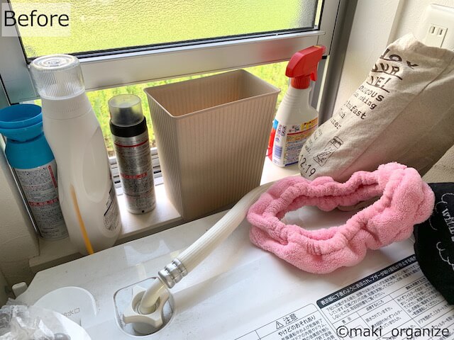 サイゾーウーマン暮らし住まい全部100均で洗面台を片付け 暮らし [連載]30代女子の「煩悩部屋」ビフォーアフター 洗面台収納の悩みは、「100均」で全部解決! 家族4人分のアイテムが劇的に片付くビフォー・アフター【3】 2021/05/17 19:30 伊藤まき(収納ライター) 「汚部屋」ビフォーアフター Before[悩み3]洗濯機の隙間に小物が落ちる 洗剤以外のボトルも、定位置を決めます(C)maki_organize 洗濯機と窓枠の隙間に小物類が落下するとお困りです。換気のために窓を開けているため、洗剤ボトルで邪魔をしないように整えます。 After[解決策]窓枠より大きめの箱で落下をブロック 洗剤の出し入れも簡単になります(C)maki_organize Kさん宅にあった、ダイソー「ワイヤーバスケット布袋付き」を使いました。窓枠より大きめの収納箱を斜めに置くことで、落下防止になります。窓を開けるときも、どかす手間が一度で済みます。 Before[悩み4]ティッシュを置く場所が欲しい 定位置が決まらないと、家族が動かします(C)maki_organize 「肌が弱いのでティッシュで顔を拭っています」とKさん。今どきは、箱型ティッシュよりフィルム包装のほうが安価で持ち運びも簡単です。でも、動かすので探す手間がかかります。それに、洗濯物に埋まって湿る心配も……。 After[解決策]利き手側に、ティッシュを吊るす Wクリップとリングで引っ掛けを作りました(C)maki_organize 洗顔後に顔を拭く動作上、利き手の右側へ「吊るし収納」にしました。使用したのは、セリアの「ウェットティッシュケース」と「コの字フック」です。たった200円で、探す手間をなくせます。扉用フックを活用すると便利です。 以上、4つのお悩みを解決できました。 最後に、洗濯機周りのビフォー・アフターで全体の違いを見ていきましょう。 次のページ [まとめ]Before:家族4人分のモノが溢れていた 前のページ12345次のページ 関連記事 脱衣所の収納が使いにくくてイライラ! 家族のパジャマと下着をスッキリ収納、劇的ビフォー・アフター【2】汚部屋ビフォー・アフター、衝撃5連発! 収納のプロが教える「片付く家になる10ポイント」狭くてイラッ、不快な「洗面室」をプロがスッキリ片付け! 6つの劇的ビフォー・アフター例プロがダイソーで買う収納グッズ1位「布製ケース」、キャンドゥからも出た! 全種が便利すぎる7つの理由ダイソー新商品、激アツ「ハーフボックス」は絶対買い! 無印そっくりで高コスパ、ニトリ他社とも徹底比較&使用例