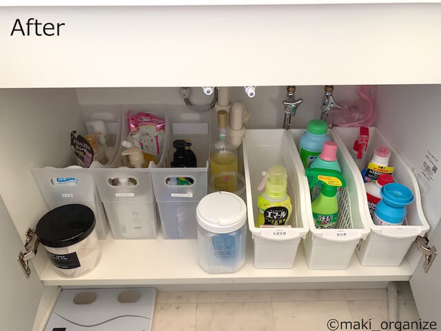 サイゾーウーマン暮らし住まい百均を使った洗面台下収納ビフォーアフター 暮らし [連載]30代女子の「煩悩部屋」ビフォーアフター 整理収納のプロが「100均グッズ」で一発手直し! 使いにくい「洗面台下」収納、解決ビフォーアフター実例 2021/05/24 19:30 伊藤まき(収納ライター) 「汚部屋」ビフォーアフター [After]開けて出す! 「ワンアクション収納」で出し入れ快適! ボトルの半分が見えれば、使い忘れも減ります(C)maki_organize ワッツの「ディリーケース コロ付きロング」には、ボトル類を。左の「ストッカーボックスA4」には、液状せっけんのストックを収納しました。浅型に、よく使うモノを。深型は、詰替パックなどを重ね置きできます。 [まとめ]他人の家を真似るより、自分サイズの収納を! しゃがんで取り出す空間には、少なめ収納が快適(C)maki_organize Kさんは、ネットで検索して見つけた収納方法を参考にして、無印良品の引き出しケースを使っていました。でも、洗面所のサイズが違ったので想像とは違う結果に。また、収納アイデアを参考にすると「詰め込む収納」になりがちです。簡単な生活を目指すなら「余裕のある収納」です。 [おまけ]100均の「吊るし収納」で、衛生面もUP! ゴム手袋クリップとフックは、Kさん私物でセリアの商品(C)maki_organize 布モノを「乾かすエリア」も100均で用意しました。お風呂のドア上に突っ張り棒を通して、バスマット干しに。ダイソーの「クリア ドアフックロング」をドアに掛けて、ローブ置きに。小さな空間には、「吊るし収納」が衛生的です。 次回は、玄関収納を取り上げます。 前のページ123 伊藤まき(収納ライター) 収納ライター・兼・整理収納アドバイザー1級。クリンネスト2級。おがくず工場に生まれ、ホテル清掃員、国鉄系レストランの厨房、内装会社、デパートの搬入搬出など“家事の土台”を極めた生活を経て、出版社入社ののち独立、現在に至る。モノを手放すほど「幸運」が舞い込むジンクスを何度も体感! 貧乏神と決別した実体験をもって、整理収納の威力をお伝えします。 記事一覧 Instagram:@maki_organize 最終更新:2021/05/24 19:30 洗面台下が魔境になってる人、多いんでない? 関連記事 洗面台収納の悩みは、「100均」で全部解決! 家族4人分のアイテムが劇的に片付くビフォー・アフター【3】キッチンカウンター収納、解決ビフォーアフター実例集! プロが“100均で簡単”機能的にスッキリ手直しキッチン収納、劇的ビフォーアフター12連発! 整理収納のプロが「100均グッズ」だけで手直し&解説汚部屋ビフォー・アフター、衝撃5連発! 収納のプロが教える「片付く家になる10ポイント」使いにくい「コンロ下&シンク下」収納、6つのポイントでスカッと機能的に激変! 次の記事 JUMP「伊野尾革命」をプレイバック >