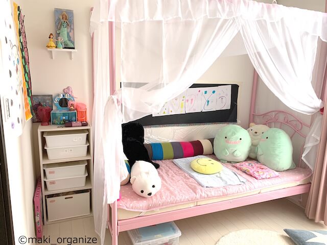 サイゾーウーマン暮らし住まい物置部屋が子ども部屋に激変!! 暮らし [連載]30代女子の「煩悩部屋」ビフォーアフター 物置部屋が、可愛らしい子ども部屋に激変!! 収納のプロが実演、使わなくなった「おもちゃラック」はアレに使うと正解 2021/07/19 19:30 伊藤まき(収納ライター) 「汚部屋」ビフォーアフター [ポイント.1]部屋のイメージは、子どもに選ばせる 部屋を作った日から、ひとりで寝起きするようになったそう(C)maki_organize 子ども自身が「自分で部屋を作った」という達成感を感じてもらうことが大切です。部屋を片付けている間に、イメージを膨らます会話を楽しみます。 お子さまの希望は、「天蓋付き・お姫様ベッド」でした。予算もちゃんと決めて、子どもと一緒に探します。このベッドのイメージを壊さずに、片付けやすい仕組みを作ります。 [ポイント.2]子どもの洋服収納は、「高さ調節」が重要! 子どもの身長に合わせた「収納の高さ」(C)maki_organize アイリスオーヤマの「ワードローブ2段」を、新たに購入しました。スチールラックの魅力は、子どもの成長に合わせて「収納の高さ」が変えられる点です。2本のパイプは、上にオフシーズン、下に今シーズンに着るものを吊り下げました。ラック上には、ダイソーの「蓋付き収納 BOX」に衣替えを保管しました。 [ポイント.3]子どもには、引き出しより「見える収納」がおすすめ! 洋服を大切に思う気持ちも育ちますように(C)maki_organize 子ども視点で選びやすいのは、洋服が「見える収納」のほう。タンスの中に「仕舞いこまない」ほうが、迷わず管理できます。また、重たい引き出しもあるので軽さの面でもオープンラックが◎。洋服を片付けるときも、タンスだと戻す場所を迷いがちです。今回選んだ「アイリスオーヤマのラック」なら、手持ちのワードローブががぜんぶ見渡せます。 また、このラック(横幅75cm)を選んだ、4つの理由も重要です。 1)バッグや帽子を掛ける、ポールフック付き 2)ベッドのイメージを壊さないカラー(白) 3)上下2段のハンガーパイプ付き 4)可動できるキャスター付き ラックの横幅は、子どもが管理しやすい量になります。部屋に付いているクローゼットの大半が、120cm幅なので大人サイズになってしまいます。また、お気に入りのバッグやベルトを掛けられる「ポールフック」も便利! 子どもの身長に合わせた高さに設置できます。 次のページ [ポイント.4]セリアの「ハンガー」「フック」なら、軽くて簡単! 前のページ1234次のページ 関連記事 コストコ「3つの掃除グッズ」が、キッチンで大活躍! ゴキブリの糞やカビにまみれた“汚台所”が劇的ピカピカにキッチン収納、劇的ビフォーアフター12連発! 整理収納のプロが「100均グッズ」だけで手直し&解説48時間で汚部屋スッキリ! 劇的ビフォーアフターで解説、「片付く家になる10ポイント」不用品を溜め込んだ「ガラクタ部屋」が劇的スッキリ! 収納のプロが解説、“今すぐ”片付けるべき3つの理由今こそ除菌掃除! プロが伝授「オキシクリーン」で汚れゴッソリ、キッチン・浴室丸ごと掃除術