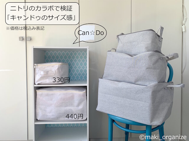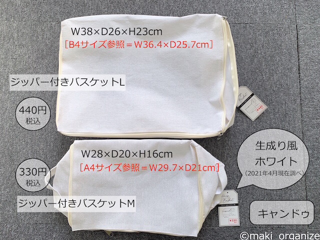 サイゾーウーマン暮らし住まいダイソー圧倒的なコスパ「フタ付き収納 BOX」、プロが選ぶ“ベストワン”! キャンドゥ「ジッパー付きバスケット」も要チェック 暮らし 伊藤まきの「お片付けSOS」相談! ダイソー圧倒的なコスパ「フタ付き収納 BOX」、プロが選ぶ“ベストワン”! キャンドゥ「ジッパー付きバスケット」も要チェック 2021/08/09 19:30 サイゾーウーマン編集部(@cyzowoman) 「お片付け・お掃除SOS」伊藤まき [価格]キャンドゥ「ジッパー付きバスケット」2種類 上から、440円、330円(すべて税込)(C)maki_organize キャンドゥのサイズは2種類で、ホワイト(ライター調べ)が発売中です。ダイソーとほぼ同じサイズで、100円アップのお値段です。生成り風のホワイトなので、部屋の色を揃えたい方におすすめです。 [サイズ]カラボで、キャンドゥのサイズ感を確認 硬質の収納箱より、ナチュラルな部屋を作ります(C)maki_organize ニトリのカラボに、キャンドゥ「ジッパー付きバスケット」を置いたサイズ感です。蓋なし収納ボックスに溜まるホコリが気になる方は、ストレスを減らすことができます。 ▼蓋なし収納ボックス▼ ダイソー・セリアの「白ボックス」一択! 100均「スクエアボックス」でカラボ収納を極める整理収納アドバイザー1級で収納ライターの伊藤まきが、家の中の “片付かない”ちょっとした悩みを“簡単で安く”解決するコツを提案します! カラボのゴッチャリ感を、「100均...サイゾーウーマン2020.09.03 次は、ダイソーとキャンドゥの収納実例です。 次のページ [実例1]ダイソーA3サイズは、厚手の毛布も簡単スッキリ! 前のページ1234次のページ 関連記事 ダイソー新商品、激アツ「ハーフボックス」は絶対買い! 無印そっくりで高コスパ、ニトリ他社とも徹底比較&使用例ダイソーの大人気で入手困難の「アレ」、セリアとキャンドゥからも出た! 超便利な5つの使用例を紹介セリアとダイソーなら5分で完成! 「絶対便利」なキャスター付き荷台の作り方を収納のプロが解説最安880円「コーナン」の激安カラボは買い! ニトリ・アイリスオーヤマより「隙間収納」にピッタリ、5つの使用例キッチンカウンター収納、解決ビフォーアフター実例集! プロが“100均で簡単”機能的にスッキリ手直し