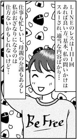 サイゾーウーマンカルチャーマンガ42歳カップル「親の介護」問題 カルチャー まんが『オバサンと言われても結婚したい!』67話 【アラフォー婚活ルポ】42歳カップル、「親の介護」問題に直面! 彼の母はアルツハイマーで…… 2021/08/04 13:30 白戸ミフル(マンガ家) オバサンと言われても結婚したい! 母親の介護もあるしね…… ――続きは8月8日公開! 前のページ123 白戸ミフル(マンガ家) 神奈川県出身。漫画家・ライター。タレント活動の後、マスコミ系の職業を渡り歩き、現在は化粧品メーカーに勤務。合コン歴20年以上、累計回数2500回以上。女性向けwebメディアほか、男性向けメディア、旅系メディア等でライターとして幅広く執筆。著書『合コン・アンド・ザ・シティ 恋活・婚活女子の合コンマニュアル』(ごきげんビジネス出版)、 『乳がんステージ4だった私が、それでも合コンに行きまくって救われた話』(キノブックス) 記事一覧 X:@takara0722 Instagram:@tamifull0722 【アラフォー闘病&婚活記】 最終更新:2021/08/04 13:30 結婚と同時に介護スタートも見える 関連記事 【アラフォー婚活ルポ】料理上手な彼の「おなか」はまるで妊婦! デブまっしぐらの食事にドン引き【アラフォー婚活ルポ】「バツイチだけどまた結婚したい」彼の告白にゴクッ……ついに王手か!?【アラフォー婚活ルポ】42歳で「将来を見据えたお付き合い」スタート! でも心に引っかかるのは……【アラフォー婚活ルポ】カラオケでの熱唱姿にドン引き!! なんつーか、かっこいいと言うより……【アラフォー婚活ルポ】こんなこと言うの、めんどくさい女かな? デート相手のLINEに返した言葉 その他の作品を読む 次の記事 「ディズニー・ヴィランズ」次に実写化してほしいキャラ >
