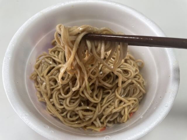 これは! 「どん兵衛」の冷やしカップそばの麺と比較する価値がある。どん兵衛は麺がモチモチしていた。
