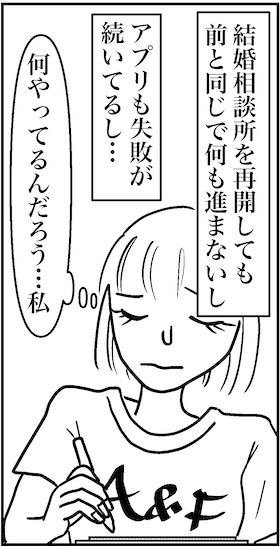 サイゾーウーマンカルチャーマンガ婚活で負のループに…… カルチャー まんが『オバサンと言われても結婚したい!』93話 【アラフォー婚活ルポ】結婚相談所は進まない、アプリも失敗続き。なにやってるんだろう、私? 2021/12/22 13:30 白戸ミフル(マンガ家) オバサンと言われても結婚したい! 負のループにはまる 次のページ お母さん74歳かあ 前のページ123次のページ 関連記事 【アラフォー婚活ルポ】相手のマンションは◎◎!? 泊まり覚悟も『絶対ヤバい!』と我に返ったワケ【アラフォー婚活ルポ】23歳男子とうっかり泥酔した結果……お泊まりコース!?【アラフォー婚活ルポ】「うちに来ませんか?」23歳男子から終電前のお誘い! 43歳、どうする?【アラフォー婚活ルポ】23歳男子、可愛いしイケメンだけど……話が合わないし面白くない【アラフォー婚活ルポ】23歳の男子からアプローチが! かわいいけどさすがに……会ってみる? その他の作品を読む