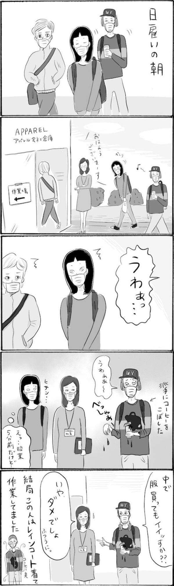 サイゾーウーマンカルチャーマンガ柿ノ種まきこ『アラサー独身女、今日も日雇いで生きてます』【日雇いマンガ】127~133話 カルチャー 【連載】柿ノ種まきこ『アラサー独身女、今日も日雇いで生きてます』 【日雇いマンガ】『アラサー独身女、今日も日雇いで生きてます』【127~133話まとめ読み】 2021/12/31 13:00 柿ノ種まきこ(マンガ家) マンガ柿ノ種まき子日雇い ――「キツイ」「汚い」「男臭い」……なんとなく近寄りがたいイメージのある“日雇労働”。その、実態はどのようなものなのか? 日雇い労働を生業とするアラサー・柿ノ種まきこが、日雇いの日々と人間模様を紹介します。 今回は127〜133話をまとめ読みでお送りいたします。 (1〜7話はこちら)(8〜14話はこちら)(15〜21話はこちら) (22〜28話はこちら)(29〜35話はこちら)(36〜42話はこちら) (43〜49話はこちら)(50〜56話はこちら)(57〜63話はこちら) (64〜70話はこちら)(71〜77話はこちら)(78〜84話はこちら) (85〜91話はこちら)(92〜98話はこちら)(99〜105話はこちら) (106〜112はこちら)(113〜119はこちら)(120~126話はこちら) 第127話『気分はニューヨーカー!? イマドキ男子のトンデモ異臭騒ぎ』 ©柿ノ種まきこ 日雇いの朝に非常事態! いくら現場がアパレルピッキングでも、その場で服は調達できませんよ〜!! 通勤時にこぼしやすい紙カップコーヒーは避けるべきかもしれせんね(汗) 第128話『限界トリップ! ライン作業中に女が見たものとは……!?』 ©柿ノ種まきこ ひたすら流れていく同じ商品を眺めていると、限界に近づいた頃に幻影が見えてくる……!? こういう時はしっかり目を見開いて幻影を追い払ってお仕事に集中集中! 次のページ 第129話『流行敏感ガールになれちゃう!! 特権つき作業』 12345次のページ 関連記事 【日雇いマンガ】『アラサー独身女、今日も日雇いで生きてます』【36~42話まとめ読み】【日雇いマンガ】『アラサー独身女、今日も日雇いで生きてます』【29~35話まとめ読み】【日雇いマンガ】『アラサー独身女、今日も日雇いで生きてます』【22~28話まとめ読み】【日雇いマンガ】『アラサー独身女、今日も日雇いで生きてます』【15~21話まとめ読み】【日雇いマンガ】『アラサー独身女、今日も日雇いで生きてます』【8~14話まとめ読み】 その他の作品を読むバックナンバーを読む