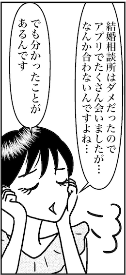 サイゾーウーマンカルチャーインタビューアラフォー婚活女3人が相談所をやめた理由 カルチャー 「オバサンと言われても結婚したい!』トーク編 『ザ・ノンフィクション』専業主婦希望の婚活結果は? アラフォー3人が本音告白、「結婚相談所はもう入らない」!? 2022/01/23 14:00 サイゾーウーマン編集部 オバサンと言われても結婚したい! アプリで出会った男たち ミフル あさみ、アプリで彼氏できてたよね。 あさみ うん。2年前、40の時だね。2年前に初めてペアーズをやってみようと思って。2018年の暮れに始めて、19年ぐらいの頭に会って、付き合った人が1人いました。アプリ上で結構やりとりを交わしていて、会う前から割と好きだったんですよ。話がすごい合うかも、みたいな期待があって。 ミフル 見た目も? あさみ めっちゃ好みではないけど、イケメンだなとは思った。薄い顔が好きなんですけど彼は濃いめの顔だったから、タイプじゃないけど、すごいハンサムだね、みたいな感じです。会ってみてやっぱりいいなっていう感じで、ポンポンポンと話が進んで付き合ったんですけど。 ▼続きはマンガで▼ 【アラフォー婚活ルポ】ペアーズでトントン拍子に付き合った彼には、重大な欠点があった!――合コン歴20年以上、累計回数2,500回以上、30代なかばに乳がんで闘病するも、現在は絶賛婚活中のライター・漫画家の白戸ミフルが「アラフォー婚活」の実体験をほぼリアルタ...サイゾーウーマン2021.09.22 ミフル なるほどね。私はアプリのプロフィール欄に「婚活でやってます。なので結婚願望ない人はメッセージもいいねもしないでください。迷惑です」って書いてるのね。だからモチベーション高い人しか来ないし、来たところでちゃんとプロフィール読んでくれた? って確認するから、そういう意味での無駄はないかなって思ってるんだよね。タメになるかわからないけど、おすすめです。 ミサは、アラフォーだから一応35としてから彼氏っていた? ミサ アプリで本当に好きになった人いないんですよね、正直言うと。「好きにならなきゃいけないのかな」みたいな感じでアプリをやってて、「やっぱり好きになれないや」とか言ってるうちに、職場で全然好きじゃなかった人を好きになってしまうケースとかあって。だから、会ったりコミュニケーションをとる回数を重ねると好きになりがちだなっていう分析はできた。 ▼続きはマンガで▼ 【アラフォー婚活ルポ】婚活アプリでたくさんの人に会ったアラフォー3人がたどり着いた結論――合コン歴20年以上、累計回数2,500回以上、30代なかばに乳がんで闘病するも、現在は絶賛婚活中のライター・漫画家の白戸ミフルが「アラフォー婚活」の実体験をほぼリアルタ...サイゾーウーマン2021.09.26 あさみ なるほど。身近で距離の近い人がやっぱりいいんだ。 ミサ 職場とかだと、強制的になんの意思もなく会うじゃないですか。知らないうちに人柄を知って、なんとなくいいところとか合わないところとかわかって。それでも話したいって思える相手も現れたりして、「え、好きかも」みたいな。アプリだと、それがなかなかないかな。 ミフル 平均的に、アプリで知り合って実際に会うまで、どのぐらい時間かけますか? あさみ わりとすぐ。大体やりとりして1週間ぐらい、話が合うかなと思ったら「1回会いますか」みたいな感じになっちゃうかな。長くても2週間で大体会う。 ミフル ミサも? ミサ 私もすぐ会う派ですね。LINEだけだと伝わらないこととかもあるので、やっぱり会って話したいなって思う。 あさみ さっさと会ってみたほうが印象もわかるし、「え、違うじゃん!」っていうのもないし、いいのかなっていうのもあって。 ミフル なるほどね。若い子とかって、長々とメッセージを交わすのが好きなイメージだから、「すぐに会う」という意見が昭和ぽい感じがして、私は安心しました(笑)。 次のページ アプリも結局は相性? 前のページ1234次のページ 関連記事 アラフォー婚活女3人が、マッチングアプリをやってみた結果……! ペアーズ・タップル・Yahoo!パートナー・東カレの傾向と“戦歴”語ります【アラフォー婚活ルポ】結婚相談所でもアプリでもない? アラフォー3人の「自分に合った出会い方」【アラフォー婚活ルポ】婚活アプリでたくさんの人に会ったアラフォー3人がたどり着いた結論【アラフォー女3人婚活トーク】「出会いが減った」のは幻想!? 「アプリがある限り、出会いはある」ただし……【アラフォー婚活ルポ】このまま付き合っていていいのか? 会わないまま1カ月経過した結果