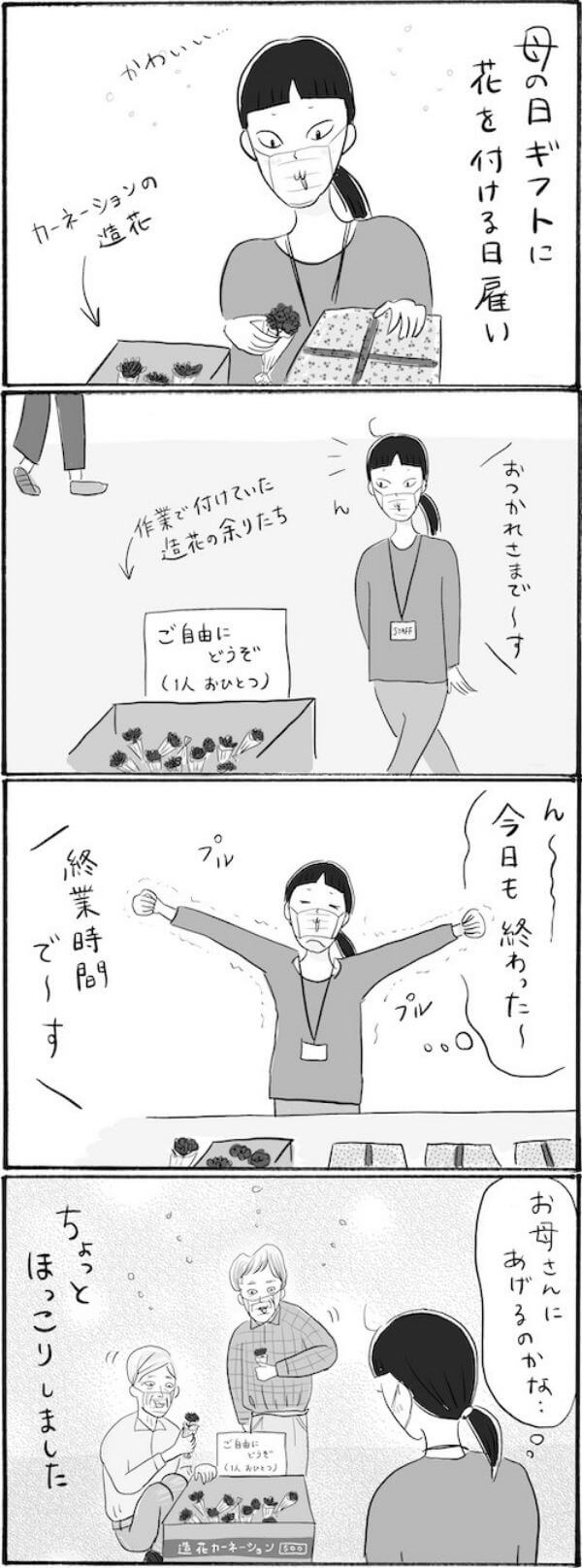 サイゾーウーマンカルチャーマンガ柿ノ種まきこ『アラサー独身女、今日も日雇いで生きてます』【日雇いマンガ】149~155話 カルチャー 【連載】柿ノ種まきこ『アラサー独身女、今日も日雇いで生きてます』 【日雇いマンガ】『アラサー独身女、今日も日雇いで生きてます』【149~155話まとめ読み】 2022/01/03 13:00 柿ノ種まきこ(マンガ家) 日雇いマンガ柿ノ種まき子 ――「キツイ」「汚い」「男臭い」……なんとなく近寄りがたいイメージのある“日雇労働”。その、実態はどのようなものなのか? 日雇い労働を生業とするアラサー・柿ノ種まきこが、日雇いの日々と人間模様を紹介します。 今回は149~155話をまとめ読みでお送りいたします。 (1〜7話はこちら)(8〜14話はこちら)(15〜21話はこちら) (22〜28話はこちら)(29〜35話はこちら)(36〜42話はこちら) (43〜49話はこちら)(50〜56話はこちら)(57〜63話はこちら) (64〜70話はこちら)(71〜77話はこちら)(78〜84話はこちら) (85〜91話はこちら)(92〜98話はこちら)(99〜105話はこちら) (106〜112はこちら)(113〜119はこちら)(120~126話はこちら) (127~133はこちら)(134~140はこちら)(141~147話はこちら) 第149話『脛かじり最高!? 実家ぐらし女子のお仕事事情』 ©柿ノ種まきこ 日雇い作業と比べると、 やっぱり家業はラクできていいな〜と思ってたら、一番嫌なデメリットを発見……! まぁ実家に住んで脛かじらせてもらってるので文句は言えないのです……。 ※漫画内では表現上省略していますが作業中はマスクをしています。 第150話『作業終了後、おじさまたちがこぞって持ち帰るアレとは……?』 ©柿ノ種まきこ 母の日ギフトの日雇い。ラッピングのカーネーションを付けていく作業です。 余っていたカーネーションの造花を持ち帰ったおじさん達……奥さんにあげるのかな?お母さんかな? なんか微笑ましい光景でした。 ※漫画内では表現上省略していますが作業中はマスクをしています。 次のページ 第151話『赤っ恥がすぎる!? 横文字かぶれおじさんの悲劇!』 1234次のページ 関連記事 【日雇いマンガ】『アラサー独身女、今日も日雇いで生きてます』【36~42話まとめ読み】【日雇いマンガ】『アラサー独身女、今日も日雇いで生きてます』【29~35話まとめ読み】【日雇いマンガ】『アラサー独身女、今日も日雇いで生きてます』【22~28話まとめ読み】【日雇いマンガ】『アラサー独身女、今日も日雇いで生きてます』【15~21話まとめ読み】【日雇いマンガ】『アラサー独身女、今日も日雇いで生きてます』【8~14話まとめ読み】 その他の作品を読むバックナンバーを読む