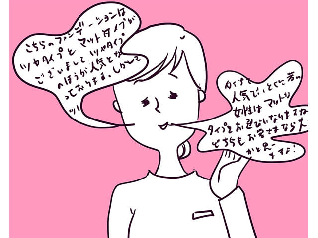 サイゾーウーマンコラム名品揃いの人気デパコス・スックへ突撃! 店員の流暢な“セールストーク”に萎縮して…… コラム 【連載】“買い物狂い” の散財日記 第183回 名品揃いの人気デパコス・スックへ突撃! 店員の流暢な“セールストーク”に萎縮して…… 2022/01/09 19:00 千葉N子(ライター) “買い物狂い” の散財日記 (C)千葉N子 ――2年で1,300万円以上溶かし、現在借金は●00万円の“買い物狂い”のライターが、苦しくも楽しい「散財」の日々を綴ります。 ご存じの方もいるかと思いますが、千葉N子は田舎に住んでいるのですよ。デパートもなく、社交場といえば、2階建てのイオンかスターバックスコーヒー。無論、デパコスを売っているお店などありません。そんな田舎住みの私なので、デパコスにかける思いは人一倍……!! 「デパコスほし~~~デパコスほし~~~~!!!!」と、よだれをたらしながらYouTubeや雑誌を眺めているのです。 そんなある日、仙台に行くことになりまして。「SUQQU(スック)」に突撃してやる~~~~!!!! ガオ~~~~!!!!」と私は俄然、燃え上がりました。SUQQUとは、デパコス界の中でも一目置かれた人気の化粧品ブランド。アイシャドウやファンデーションなど、「名品」が多いのです。 えーと、まずはお粉が欲しい! でもって、ファンデーションも欲しい!! お粉とファンデーションでいくらくらいするのかなあ。そんなことを考えて眠れない夜を過ごした翌日、私はステディとデートで仙台に出かけ、SUQQUのお店に向かいました。 えーとえーと、お粉とファンデーション……お粉とファンデーション……!! そう思いながら店内を物色していると、 「なにかお探しでしょうか?」 店員さんに話しかけられちゃった! どどどどどどうしよう。激しくなる動悸。デパコス慣れしていない女が突然、店員さんに話しかけられると、あたふたしちゃうのよ! これってデパコスあるあるじゃない!? 今、ウンウンって頷いた人、いるわよね!? 「あ、あ、え、えっと……。お粉が……ほ、欲しいんですけど」 まるで北の国からの口下手なお父さんのように、私は口をすぼめながら下を向きました。すると、店員さんは「パウダーはこちらになります!」と素早く私を誘導してくれました。ほっ……。なんとか第一関門は突破したぞ……。 しかし、問題はここからでした。次に店員さんはこう言ったのです。 「どんな仕上がりをご希望ですか?」 ど、どんな仕上がり……? 「仕上がり」ってなに……??? 私「あの……仕上がり、とは?」 店員さん「ツヤを出したいですとか、マットに仕上げたいですとか、あとはキラキラさせたいとかです」 ツヤ、マット……わ、わかるぞ!! あたしにはわかるぞ!!!! 実戦経験は皆無だけど、これは何度も何度も雑誌で読んだものだ!!!! ツヤ肌っつーのは、つやつやテカテカして見えるお肌で、マット肌っちゅーのは、カバー力を重視するときの肌の状態よね!? 私「ツ……ツヤでしょうか」 店員さん「でしたら、こちらの『オイルリッチグロウルースパウダー』か『シアールースパウダー』『ナチュラルカバーリングルースパウダー』ですね。カバー力と、透明感のあるタイプどちらがよろしいですか?」 ひいいい、次々と呪文のような言葉を投げかけられるウゥゥ!! 次のページ スック定員の流れるようなセールストークに、思わず萎縮 12次のページ 関連記事 最高額は90万円超え! 買い物狂いが2022年に買いたいジュエリー3選合計約200万円! 買い物狂いが「2021年に買った高額商品ベスト3」メルカリのアプリをせっかく削除したのに……買い物狂いがラクマで7万円を散財した2つの“理由”カードの支払い額が月96万円を超えた買い物狂い、“メルカリ断ち”を決意した直後に7万円を散財したワケメルカリで5万のマフラーが、ディスカウントショップで3万円!? 買い物狂い、危うく詐欺サイトの被害に