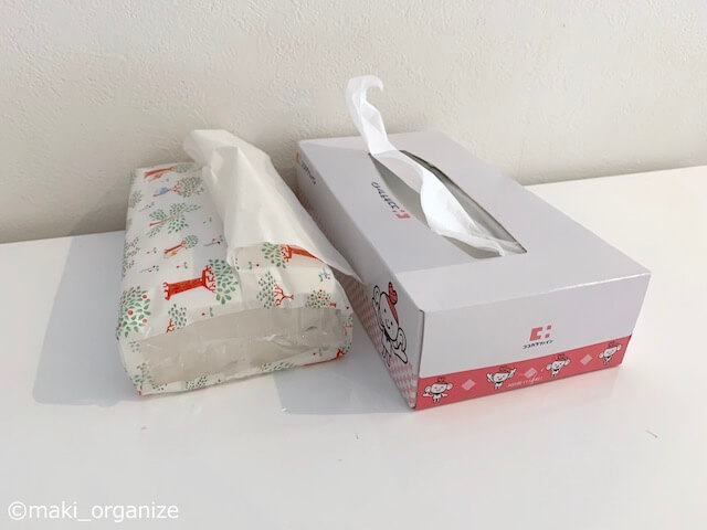 かさばる「外箱」を外して中身を出す。わかりやすい例が、写真上のティッシュボックスです。箱付きのほうがそのまま使えて便利ですが、総合的な収納力やコスパが変わってきます。片付け訪問では、家中の消耗品・食品・家電・季節の飾りなど、使うモノの「外箱」をほぼ外します。それにより、家中がティッシュボックスのように「コンパクト」になります。