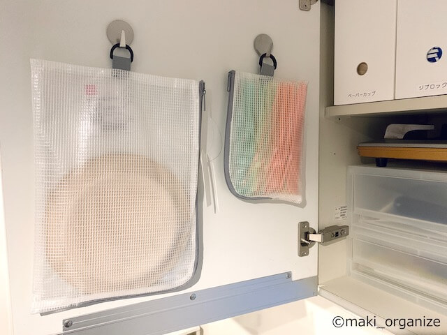 硬質の収納箱はやめて、布ケースホッピングバッグビニールケース、透明の袋を使います。これは、何度も記事にしているのでバックナンバーでご確認ください。BOX収納をやめると、驚くほど軽くてスッキリします。小さな消耗品(ストロー、水切りネット、紙皿、お箸など)も、ビニールケースなら場所をとりません。扉裏や隙間に吊るせるので、収納スペースにゆとりが出せます。