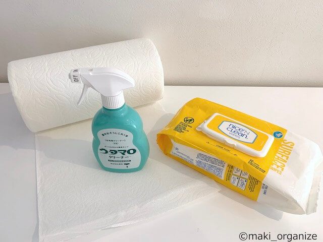 例えば、キッチンペーパーとウタマロクリーナーの組み合わせ。コストコの「カークランド ハウスホールドワイプ」も、万能シートです。どちらも、シートが乾きにくいので長く使えます(コストコのお掃除シートは価格が高く感じますが、1枚で何カ所も汚れを落とすことができます。ただし洗剤が強いのでニス付きフローリングはNG)。