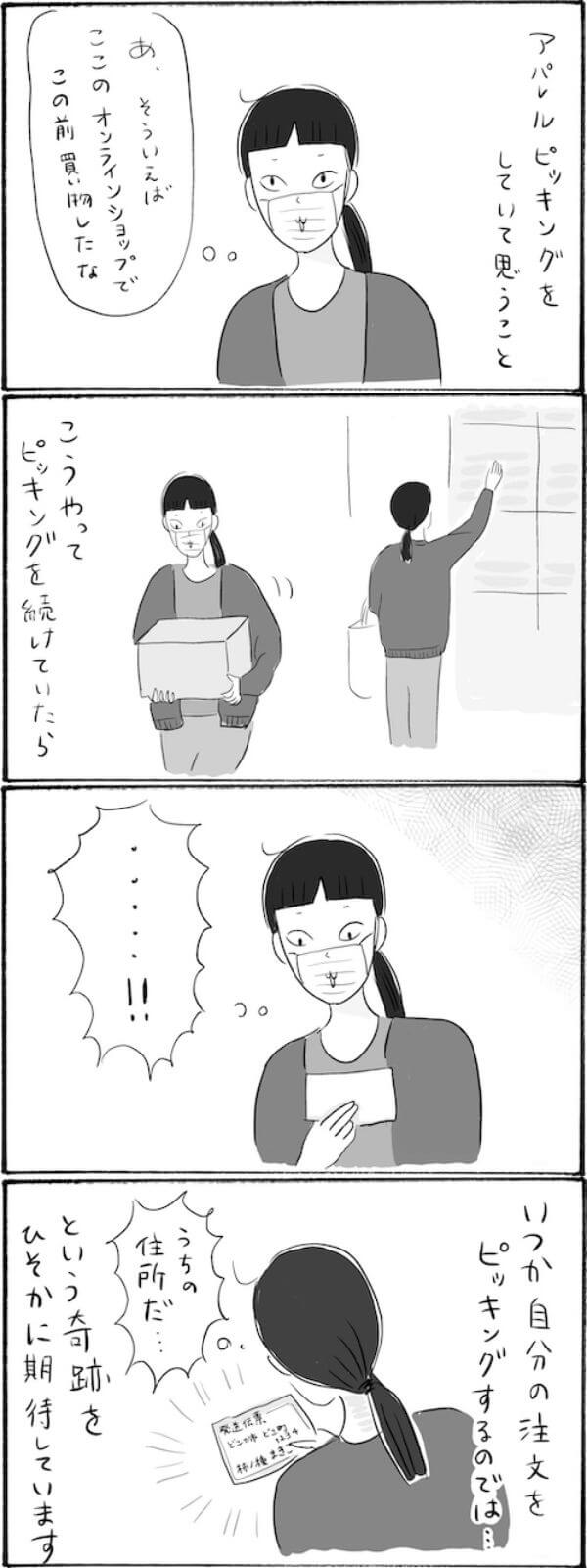 サイゾーウーマンカルチャーマンガ柿ノ種まきこ『アラサー独身女、今日も日雇いで生きてます』【漫画】あるかもしれな奇跡の出会い カルチャー 【連載】柿ノ種まきこ『アラサー独身女、今日も日雇いで生きてます』 【日雇いマンガ】193話『ベテラン日雇いワーカーの奇跡!? アパレルピッキングにて……』 2022/03/03 13:00 柿ノ種まきこ(マンガ家) マンガ柿ノ種まき子日雇い ――「キツイ」「汚い」「男臭い」……なんとなく近寄りがたいイメージのある“日雇労働”。その、実態はどのようなものなのか? 日雇い労働を生業とするアラサー・柿ノ種まきこが、日雇いの日々と人間模様を紹介します。 第193話『ベテラン日雇いワーカーの奇跡!? アパレルピッキングにて……』 ©柿ノ種まきこ 毎日たくさんの商品をピッキングしている倉庫の現場。自分の通販した商品をピックする確率は相当低いと思いますが、いつか出会うんじゃないかとそわそわしています。 ――毎週、木曜日に最新話を更新。次回194話は3月10日(木)の更新予定です。 柿ノ種まきこ(マンガ家) 日雇いをしながらマンガを描くアラサー。過去には、「iVERY」にて婚活マンガ『女もつらいよ』を連載。現在はインスタグラムにて、マンガを不定期投稿。 Instagram:@kakinotane_makiko LINEスタンプ大好評発売中! 最終更新:2022/03/03 13:32 関連記事 【日雇いマンガ】『アラサー独身女、今日も日雇いで生きてます』【149~155話まとめ読み】【日雇いマンガ】『アラサー独身女、今日も日雇いで生きてます』【141~148話まとめ読み】【日雇いマンガ】『アラサー独身女、今日も日雇いで生きてます』【134~140話まとめ読み】【日雇いマンガ】『アラサー独身女、今日も日雇いで生きてます』【127~133話まとめ読み】【日雇いマンガ】184話『年の瀬の一期一会なほっこり体験~今年最後のとある現場より~』 その他の作品を読むバックナンバーを読む 次の記事 若槻千夏、子の教育は何もしない? >