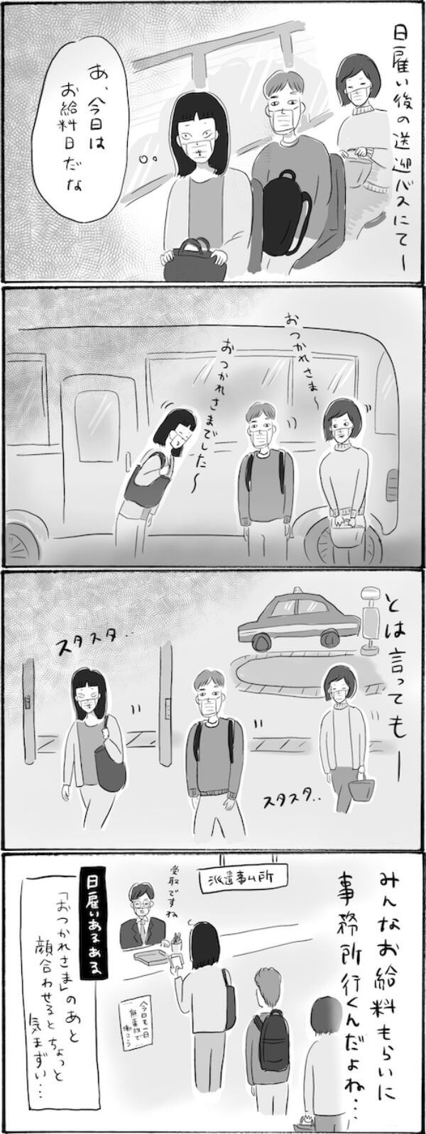 サイゾーウーマンカルチャーマンガ柿ノ種まきこ『アラサー独身女、今日も日雇いで生きてます』【漫画】給料日の気恥ずかしい週間 カルチャー 【連載】柿ノ種まきこ『アラサー独身女、今日も日雇いで生きてます』 【日雇いマンガ】194話『日雇い名物!? ちょっと気恥ずかしくなる給料日』 2022/03/10 13:00 柿ノ種まきこ(マンガ家) マンガ柿ノ種まき子日雇い ――「キツイ」「汚い」「男臭い」……なんとなく近寄りがたいイメージのある“日雇労働”。その、実態はどのようなものなのか? 日雇い労働を生業とするアラサー・柿ノ種まきこが、日雇いの日々と人間模様を紹介します。 第194話『日雇い名物!? ちょっと気恥ずかしくなる給料日』 ©柿ノ種まきこ 送迎バスで降りたタイミングで「お疲れ様でした〜」とは言うものの、結局また事務所で顔を合わせてしまう……。お互いに苦笑というかなんとも言えない空気が流れる瞬間です。 ――毎週、木曜日に最新話を更新。次回195話は3月17日(木)の更新予定です。 柿ノ種まきこ(マンガ家) 日雇いをしながらマンガを描くアラサー。過去には、「iVERY」にて婚活マンガ『女もつらいよ』を連載。現在はインスタグラムにて、マンガを不定期投稿。 Instagram:@kakinotane_makiko LINEスタンプ大好評発売中! 最終更新:2022/03/10 13:00 関連記事 【日雇いマンガ】『アラサー独身女、今日も日雇いで生きてます』【149~155話まとめ読み】【日雇いマンガ】『アラサー独身女、今日も日雇いで生きてます』【141~148話まとめ読み】【日雇いマンガ】『アラサー独身女、今日も日雇いで生きてます』【134~140話まとめ読み】【日雇いマンガ】『アラサー独身女、今日も日雇いで生きてます』【127~133話まとめ読み】【日雇いマンガ】184話『年の瀬の一期一会なほっこり体験~今年最後のとある現場より~』 その他の作品を読むバックナンバーを読む 次の記事 すとぷり・ななもり。、二股告発で炎上 >