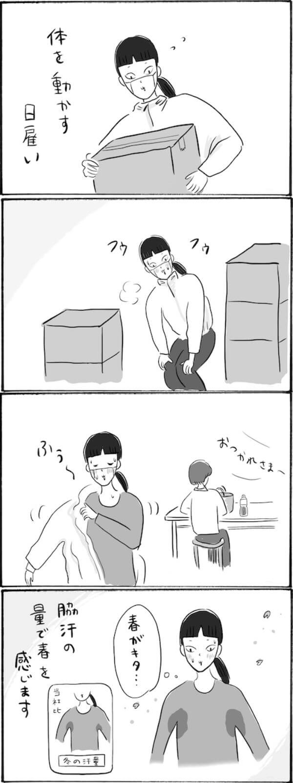 サイゾーウーマンカルチャーマンガ柿ノ種まきこ『アラサー独身女、今日も日雇いで生きてます』【漫画】“アレ”の量で感じる春の訪れ カルチャー 【連載】柿ノ種まきこ『アラサー独身女、今日も日雇いで生きてます』 【日雇いマンガ】195話『じわじわとシミる“アレ”の量で感じる春の訪れ』 2022/03/17 13:00 柿ノ種まきこ(マンガ家) 日雇いマンガ柿ノ種まき子 ――「キツイ」「汚い」「男臭い」……なんとなく近寄りがたいイメージのある“日雇労働”。その、実態はどのようなものなのか? 日雇い労働を生業とするアラサー(いつの間にかアラフォーに)・柿ノ種まきこが、日雇いの日々と人間模様を紹介します。 第195話『じわじわとシミる“アレ”の量で感じる春の訪れ』 ©柿ノ種まきこ 毎年暖かくなってくると、やってくるあの現象……。脇汗で春を感じるアラフォーです。 ――毎週、木曜日に最新話を更新。次回196話は3月24日(木)の更新予定です。 柿ノ種まきこ(マンガ家) 日雇いをしながらマンガを描くアラサー。過去には、「iVERY」にて婚活マンガ『女もつらいよ』を連載。現在はインスタグラムにて、マンガを不定期投稿。 Instagram:@kakinotane_makiko LINEスタンプ大好評発売中! 最終更新:2022/03/22 19:42 関連記事 【日雇いマンガ】『アラサー独身女、今日も日雇いで生きてます』【149~155話まとめ読み】【日雇いマンガ】『アラサー独身女、今日も日雇いで生きてます』【141~148話まとめ読み】【日雇いマンガ】『アラサー独身女、今日も日雇いで生きてます』【134~140話まとめ読み】【日雇いマンガ】『アラサー独身女、今日も日雇いで生きてます』【127~133話まとめ読み】【日雇いマンガ】184話『年の瀬の一期一会なほっこり体験~今年最後のとある現場より~』 その他の作品を読むバックナンバーを読む 次の記事 ぼる塾・田辺、亀梨ファンの本音に共感 >