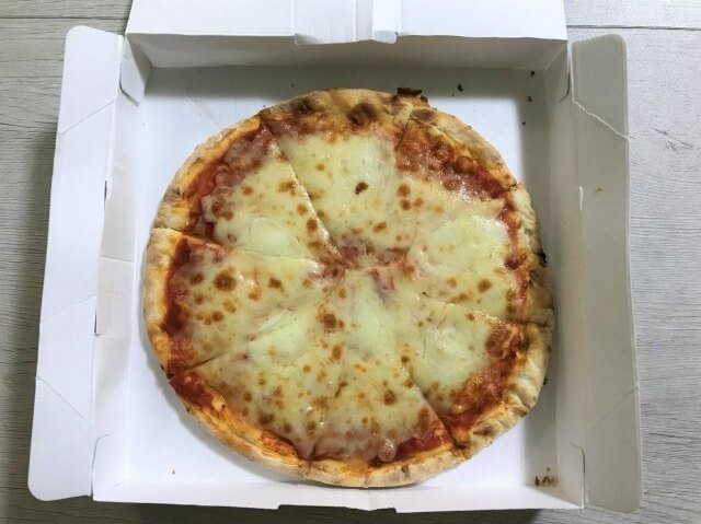 このマルゲリータピザも、うちの家族の好物です。サイゼリヤのテイクアウトメニューには、ほかにも「バッファローモッツアレラのピザ」と「ソーセージピザ」があり、どれにするかギリギリまで悩みましたが、まずは一番ベーシックなマルゲリータをお持ち帰りしてみました。箱を開けるとしっかり8等分に切られていて、すぐに食べることができる点もありがたかったです。
