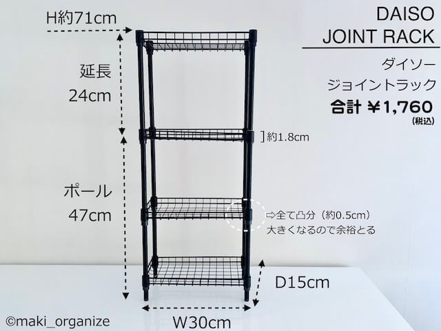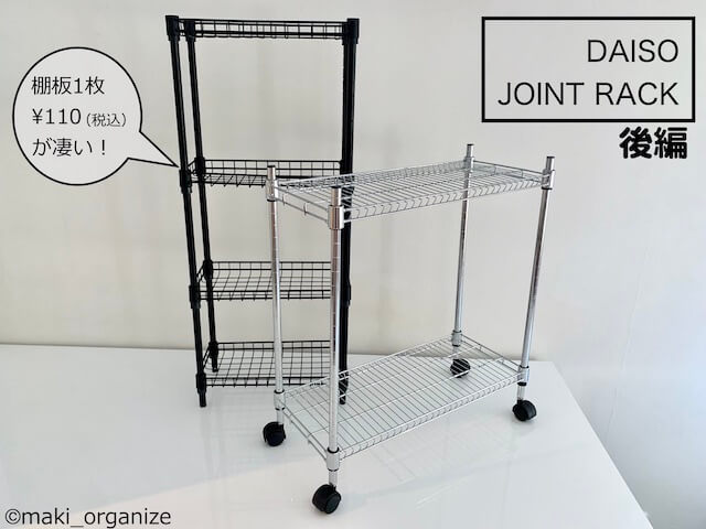 サイゾーウーマン暮らし住まいダイソー【ジョイントラック】すごい使い方 暮らし 伊藤まきの「お片付けSOS」相談! トイレ、洗濯機など“隙間”にピッタリ!! ダイソー110円「ジョイントラック」の快適収納術8例 2022/04/18 19:44 伊藤まき(収納ライター) 「お片付け・お掃除SOS」伊藤まき 整理収納アドバイザーの伊藤まきが、片付けに訪問した現場で「よくやる作業」「よく伝えるおすすめ収納法」を【プロの技】シリーズとして紹介していきます! ダイソー【ジョイントラック】 黒のラックは、全パーツ1個110円(税込)!(C)maki_organize プロの技シリーズ10回目は、ダイソー「ジョイントラック」の後編。今回は、棚板1枚110円(税込)の「W30×D15cm」を使って、さまざまな収納術を紹介します。家中の隙間や狭い空間も、スッキリ便利に変わります。 ダイソー[ジョイントラック]最小サイズの棚3種類 110円の棚は、3種類(筆者店頭、ネット店の確認による)(C)maki_organize 写真上は、ダイソー「ジョイントラック」シリーズの棚板の中で一番小さなサイズ(W30×D15cm)です。 左から、フラットな棚板(II型)無塗装、転び止め付の棚(ブラック塗装)(ホワイト塗装)の3種類。どれも1枚110円(税込)で揃えることができます。ほかのサイズの棚板は全て1枚330円(税込)です。 ダイソー[ジョイントラック]高さ71cmの組み立て例 最小サイズのジョイントラックは、延長ポールを使って高さを出して使うのがおすすめ。今回は、24cmの延長ポールを使って高さ71cmにします。 必要なパーツはこれら16点。 実際に組み立てて完成したのがこちら。組み立て方法は最後に詳しく説明します。 注意)ゴム製ハンマーで棚を強く固定する前の状態(C)maki_organize このサイズが、家中の狭くゴチャゴチャした空間やテーブル上などの散らかりやすい場所をスッキリするのに役立ちます。 では、このジョイントラックを使った使用例を8パターンを紹介していきます。 次のページ ダイソー「ジョイントラック」[使用例.1]トイレの小物、掃除グッズ収納に! 12345次のページ 関連記事 ダイソー「ジョイントラック」、激安で便利棚が完成! プロの使い方5パターン【全サイズ・色】イケア人気アイテムそっくり! ダイソー330円「ふた付収納ボックス」はマルチな必需品ダイソー収納アイデアまとめ! 収納のプロが厳選「本当に使える」アイテム24選【2022年3月最新版】ダイソー・セリア「ワイヤーネット」活用テク! プロが教える、オススメの使い方【全種類・サイズ・色】セリア・キャンドゥで買えるコレ、「見つけたら即購入」! 整理収納のプロ溺愛アイテム8つの使用例