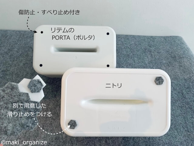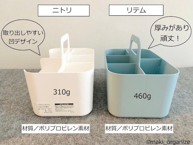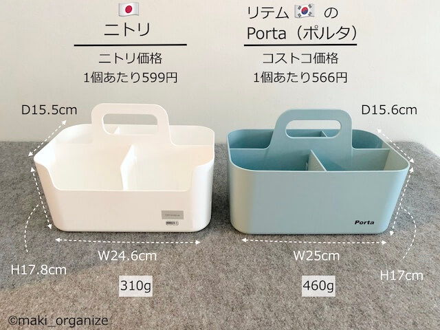 サイゾーウーマン暮らし住まいニトリ、コストコのアレそっくり! 暮らし 伊藤まきの「お片付けSOS」相談! 【ニトリ】ツールボックス、「コストコ」で人気のアレそっくり! 600円以下の最強コスパ 2022/06/20 19:00 伊藤まき(収納ライター) 「お片付け・お掃除SOS」伊藤まき 整理収納アドバイザーの伊藤まきが、片付けに訪問した現場で「よくやる作業」「よく伝えるおすすめ収納法」を紹介していきます! プロの技シリーズ16回目は、一緒に使う小物をまとめる「グループ収納」に使う「ツールボックス」です。女性向けの「ツールボックス」といえば、オシャレブランド山崎実業が人気。とはいえ、気軽に買いにくいお値段ですよね。そこで、今回は「ニトリ」の「ハコブNインボックス」をピックアップ。コストコで人気の「リテム・シスマックス」とそっくりのデザインで、600円以下という最強コスパです。 では、「ハコブNインボックス」の魅力ポイントから収納例まで紹介していきます。 【ニトリのポイント.1】コストコにサイズもデザインもそっくり! 左からニトリ「ハコブNインボックス」、リテム・シスマックス「PORTA(ポルタ)コンパクト」(C)maki_organize 写真右の青いツールボックスが、韓国ブランド「リテム・シスマックス」の「PORTA(ポルタ)コンパクト」です。コストコの人気商品で、3個セットで買わなければなりません。 その後、登場したのが「ニトリ」の「ハコブNインボックス」になります。こちらは1個から購入可能。見ての通り、デザインもサイズもコストコにそっくり! 商品名 税込価格 カラー展開 ニトリ「ハコブNインボックス」 599円 5色/白、グレー、茶、ピンク、青 *店頭確認による リテム・シスマックス「PORTA(ポルタ)コンパクト」 1,698円(3個セット) *1個あたり566円 4色/白、グレー、ピンク、青 *Amazon確認による 【ニトリのポイント.2】軽くて取り出しやすい 小物を収納しても、重くならないサイズ感(C)maki_organize 先発デザインの「リテム」は、厚みがあり頑丈です。後発の「ニトリ」は、軽さと取り出しやすさに工夫をしたように感じます。どちらも、工具箱でおなじみの「ツールボックス」のように、使う場所まで片手で持ち運べる取手付きです。また、コンパクトなサイズなので重さで傾く心配もありません。 【ニトリのポイント.3】取り外しできる「仕切り」付き 仕切り板の調整が効く自由度も◎(C)maki_organize リテムとニトリともに、1枚の仕切り板が外せるデザインです。横長の空間があることで「グループ収納」の選択が広がります。ただし「ニトリ」の仕切り板は、外れにくく、ずれにくいように作られています。 【ニトリのポイント.4】収納したまま「スタッキング」OK! 積み重ねできるから、場所を奪わない!(C)maki_organize ニトリ、リテムともに、小物を収納したまま「スタッキング」可能。「ニトリ」は1個から購入できるので、お好みの色をそろえることができます。「買いやすさ」の点では、ニトリの圧勝です。ちなみに、筆者は「ポルタ・コンパクト」の使用感が大好きでミニサイズもそろえました。 ニトリだけの魅力:サイド面の凹デザイン 側面が凹んでいるので取り出しやすい(C)maki_organize ニトリ「ハコブNインボックス」は、サイド面の凹デザインがポイント。中身がよく見えて、「取り出しやすさ」にこだわったつくりです。ボックスティッシュも入るので、テーブル上の散らかりもスッキリまとまります。日本の家に多い悩みを追求した、凹みデザインだと感じます。 ニトリの欠点:「底面ガード」がない 底面の保護を付けて、より快適に!(C)maki_organize 家具に底面が触れるので、傷を作るリスクがあります。ニトリにはガードが付いてないので、リテムの滑り止めを付けると安心。天然木のテーブル上でも心配なく使えます。100均などで用意可能。 次より、ニトリやリテムを使った「グループ収納例」を7パターンを紹介します。 【ツールボックス使用例.1】リモコンやスマホの「ガジェットボックス」に スマホ充電コーナーなど、定位置作りに(C)maki_organize リモコンが多く、決まった場所に置いていない家におすすめです。土台がしっかりしているので、ズレたり倒れたりしないところが◎。 【ツールボックス使用例.2】毎日飲むサプリなど「健康グッズ」コーナー 救急箱や茶葉セットなどにもOK(C)maki_organize 毎日飲むサプリ類は、シンク付近にあると便利。健康グッズのグループにまとめれば、一度に動かすことができます。狭いキッチンだと、調理の時間だけどかせば良いのでスッキリします。 【ツールボックス使用例.3】メイクポーチも入る「コスメボックス」に! コットンやミラーも入るデザイン(C)maki_organize 仕切り板を外して、ポーチやミラーを入れることもできます。3つの仕切りには、メイクブラシやアイメイク道具を。高さが足りない場合は、内側の底面にスポンジを詰めて調整すると良いです。 次のページ 【ツールボックス使用例.4】郵便物と文房具をまとめて「書き物セ